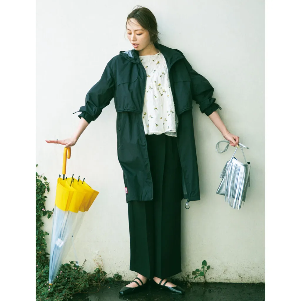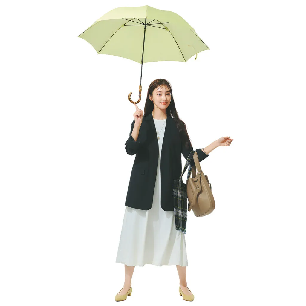 レインコートと傘を同ブランドで揃え、憂鬱な雨をコーデでむしろ楽しんじゃおう精神で乗り切るのも手。きれいめコーデにもフィットするデザインのレインコートなら、オンオフどちらも使えます。大雨の日は安心なダークカラーを選びがちだから、傘だけでもイエローでハッピー気分に!