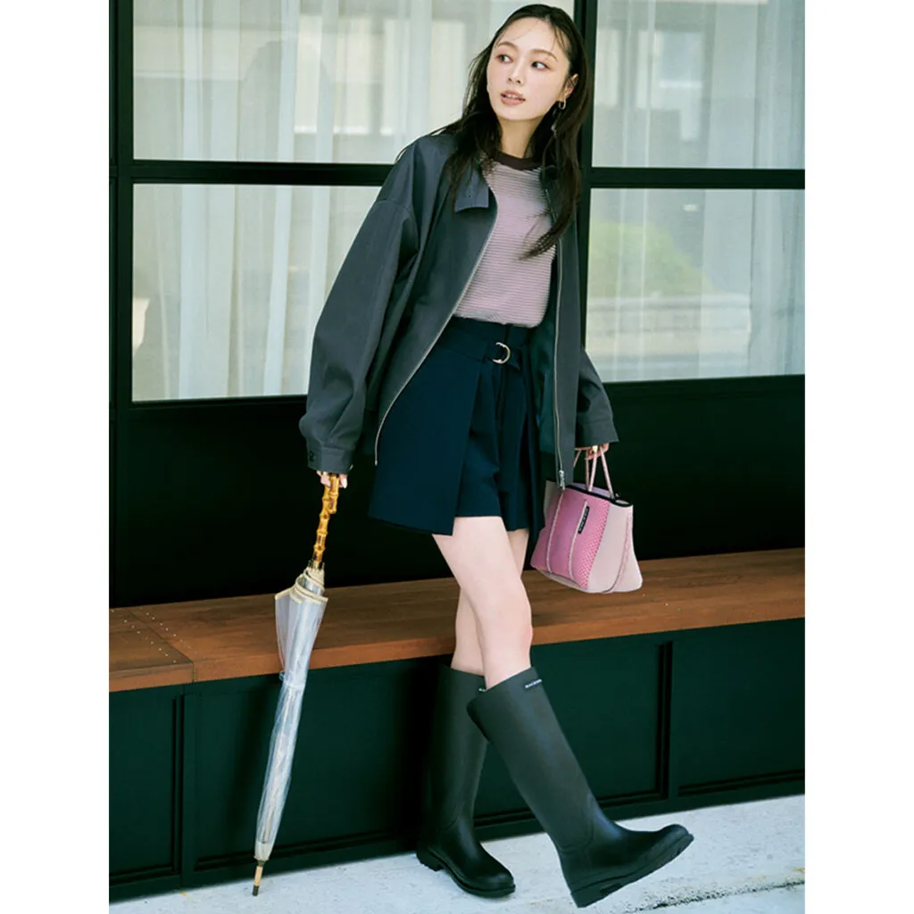 流行中のショートボトムスは、ロングレインブーツと合わせれば気恥ずかしさゼロに。土砂降りもゲリラ雷雨も、この組み合わせがいわば最適解です。全体の素材をきれいめにまとめて大人の品をキープして。