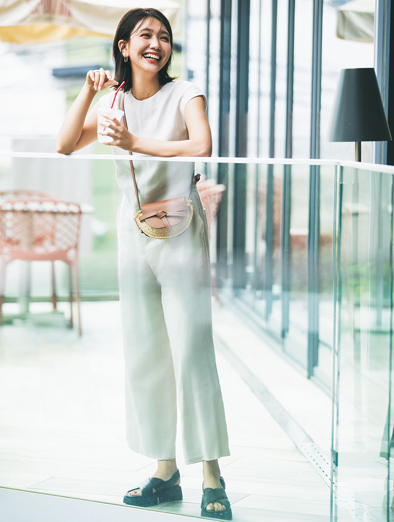 リネン素材の涼しいオールインワンにロエベのゲートバッグを合わせて、足元はゴツめのサンダルでハズしました。