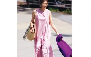 8月21日(土)、可愛らしいピンクのティアードワンピは、ストンとしたIシルエット&ハリ感素材なら、一気に大人っぽく。あえてカジュアルなビーサンを合わせることで、こなれ感がさらにアップします。かごバッグにつけたスカーフや、大ぶりのバングルが、ほどよくヘルシー見え!