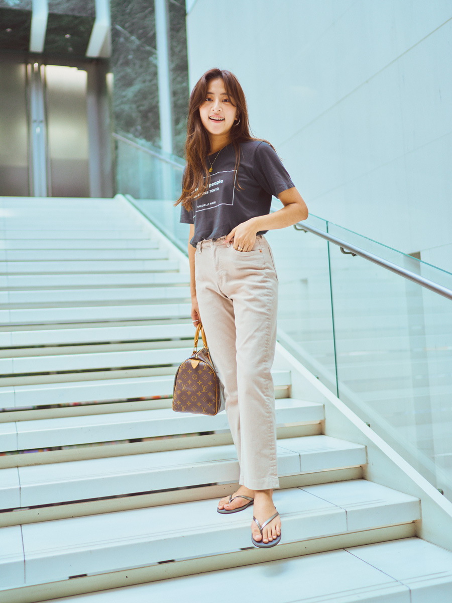 「ベージュデニムなら、いつものTシャツ×ビーサンも新鮮なイメージで着られます。ワンツーコーデにこなれ感が出るし、上品にまとまる気がして! このデニムは脚のラインを拾いすぎないストレートシルエット穿きだけでなく、穿き心地まで完璧です」
