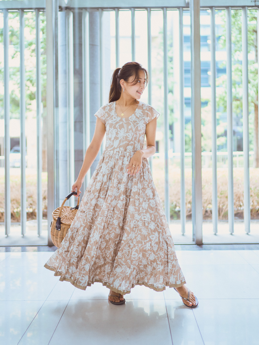 ドラマチックなワンピースはビーサン合わせで抜け感を意識