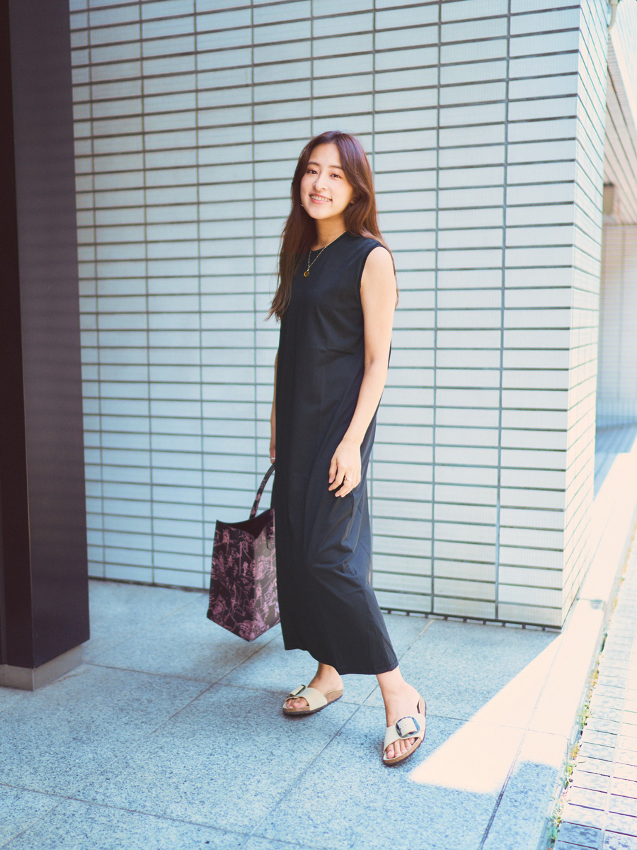 「実はこのワンピースは、私服でもともと愛用中なんです! Tシャツのような着心地の良さがありながら、光沢のあるしっかりした生地でキレイめなのが嬉しいところ。シンプルなので、小物によっていろいろなテイストで着ています。今回は柄バッグとビルケンのサンダルでバカンスっぽく」