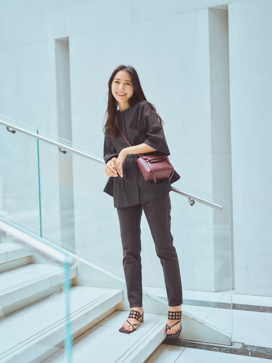 「ふわっと広がるシルエットが可愛いボリュームブラウスは、黒のワントーンでまとめて甘くなりすぎないように調節しています。ワントーンコーデに色物のバッグを合わせてポイントにしました!」