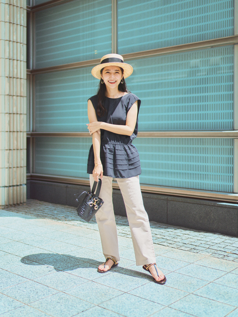 「ブルーデニムと比べてやわらかい印象のベージュデニムは、黒アイテムでコントラストをはっきりとつけて引き締めました。全体的にベーシックカラーので、ハットとサンダルで夏らしい季節感を出しています」
