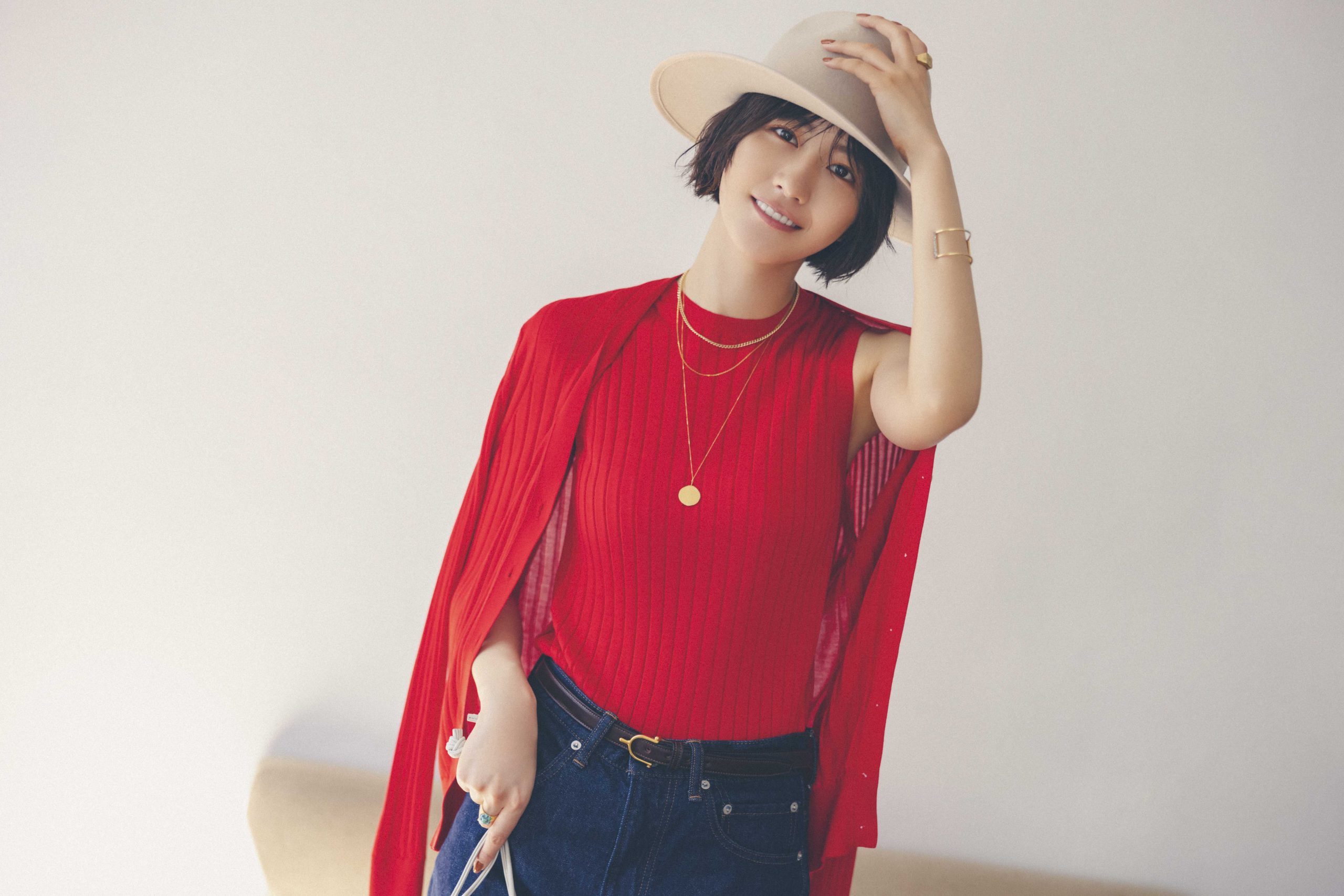 顔周りがパッと明るくなり、血色感も増す“赤”のアンサンブル。纏うだけでイキイキとしたエネルギーが湧いてきそう! いつものデニムも、さりげなくフレアシルエットにアップデート。カーディガン・ノースリーブニット/着回し デニムパンツ¥19,800(ジェーン スミス/UTS PR)バッグ¥30,800(VASIC/ヴァジックジャパン)ブーツ¥26,400(タラントン by ダイアナ/ダイアナ 銀座本店)ネックレス(上)¥27,500ネックレス(中)¥9,900ロングネックレスチェーン(下)¥15,400コインチャーム¥9,900バングル¥55,000右手ターコイズリング¥22,000左手リング¥16,500(すべてアルティーダ ウード)帽子¥14,300(OVERRIDE/OVERRIDE 神宮前店)ベルト¥10,120(トリーレザー/ビューティ&ユース ユナイテッドアローズ 渋谷公園通り店)