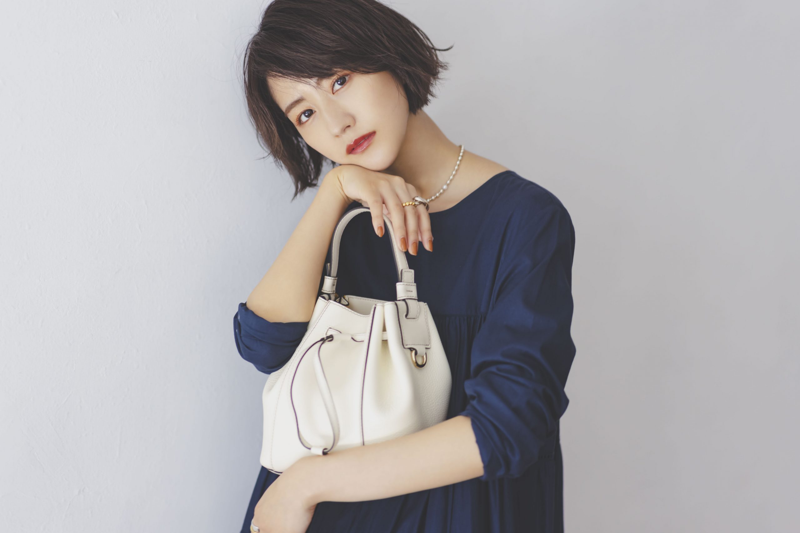 ティアードワンピはネイビーを選んで甘さを抑えつつ、白のバッグを合わせて軽やかな抜け感を! レザーバッグが醸し出す上質さが、可愛げワンピを大人っぽく導きます。バッグ/同じ ワンピース¥71,500(マーレット/サザビーリーグ)ブーツ¥25,300(Mollini/ジャック・オブ・オール・トレーズ プレスルーム)ネックレス¥41,800ピアス¥13,200左手リング¥26,400右手人差し指リング¥27,500右手中指リング¥15,400(すべてe.m./e.m.表参道店)
