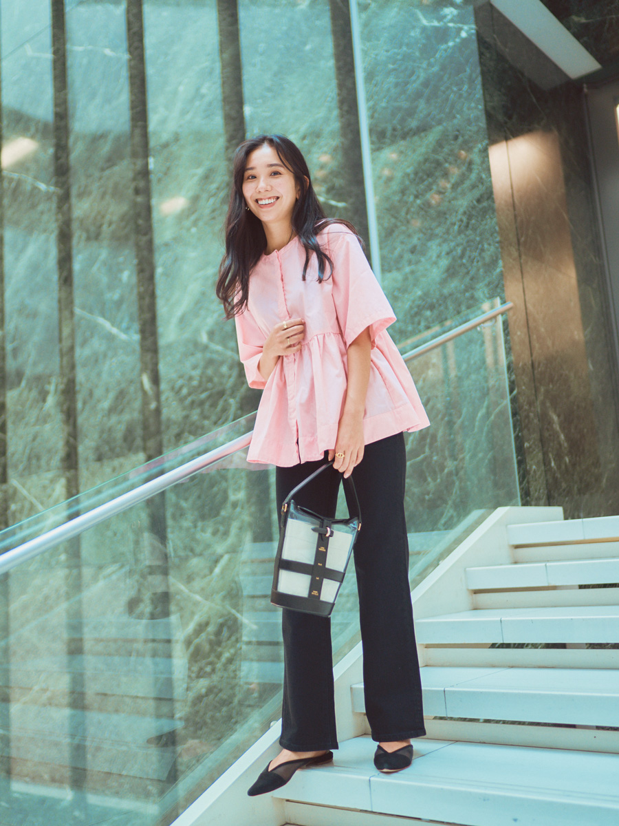 「普段ピンク系のアイテムはほとんど手に取らないのですが、このブラウスはオレンジピンクのような絶妙な色みで挑戦してみたいと思いました! ブラウスに存在感があるので、他はシンプルなアイテムを合わせています」