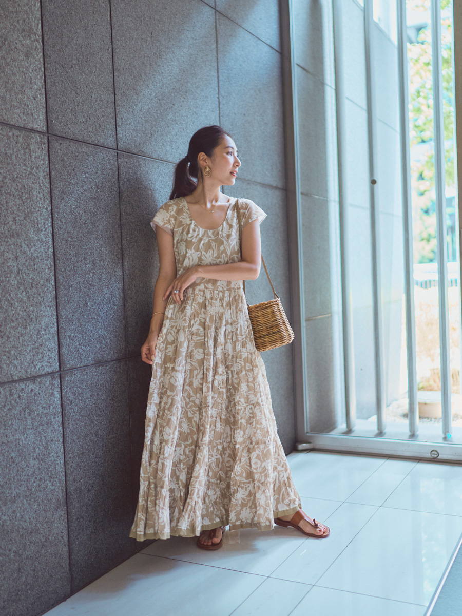 「一枚でサマになるワンピースは、156㎝の私で足元はフラットでOKでした! ワンピースがベージュ系なので、小物はかごバッグなどブラウン系と合わせて、統一感が出るようにしています」