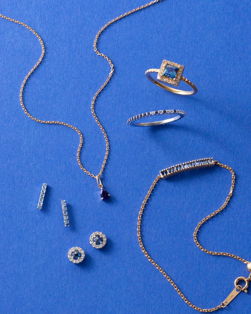 毎日着けられるさりげないサイズ感のお守りジュエリー。シックなブルーが心を落ち着かせてくれそう。ネックレス(トップ)〈YG×サファイア〉¥12,650(チェーン)〈YG〉¥16,650(ともにシエナ ロゼ/シエナ ロゼ表参道ヒルズ本店)
