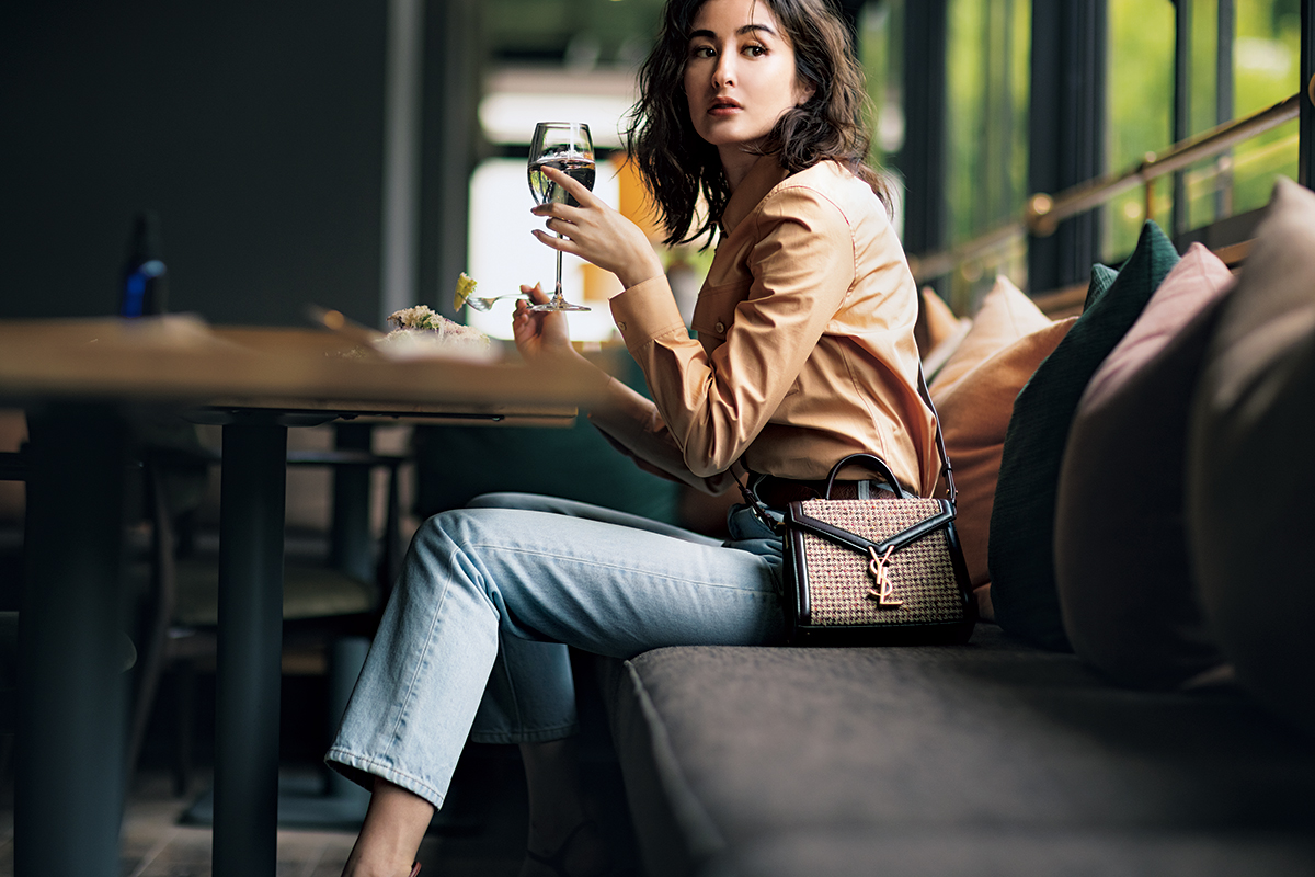 シャツとデニムという定番スタイルもシックな配色にするだけで一気に秋気分に。秋になると恋しくなるツイード×レザーの組合せを効かせれば完璧! バッグ「BABY CASSANDRA」〈H16×W20×D7.5㎝〉[ショルダーストラップ取り外し可能]¥262,900シャツ¥99,000デニムパンツ¥88,000ベルト¥51,700(すべてサンローラン バイ アンソニー・ヴァカレロ/サンローラン クライアントサービス)