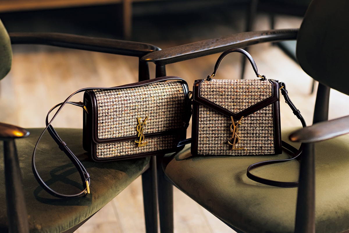 中央に配したロゴを模ったクロージャーが目を引くアイコンバッグ「ベイビー・カサンドラ」。秋はシックなツイードとレザーのコンビが登場。使いやすさはそのままに、一点投入するだけで一気に秋のムードを纏える〝イットバッグ〟です。