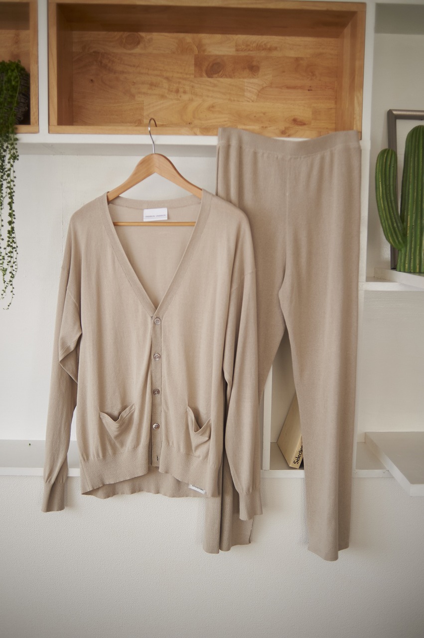 和紙素材で作られたニットのセットアップ。一枚で着てもサマになるカーディガン、パンツのウエストはドロストで、裾にはスリット入り。ニットカーディガン¥19,800ニットパンツ¥19,800(ともにUNDERSON UNDERSON/UNDERSON UNDERSON ニュウマン新宿店)