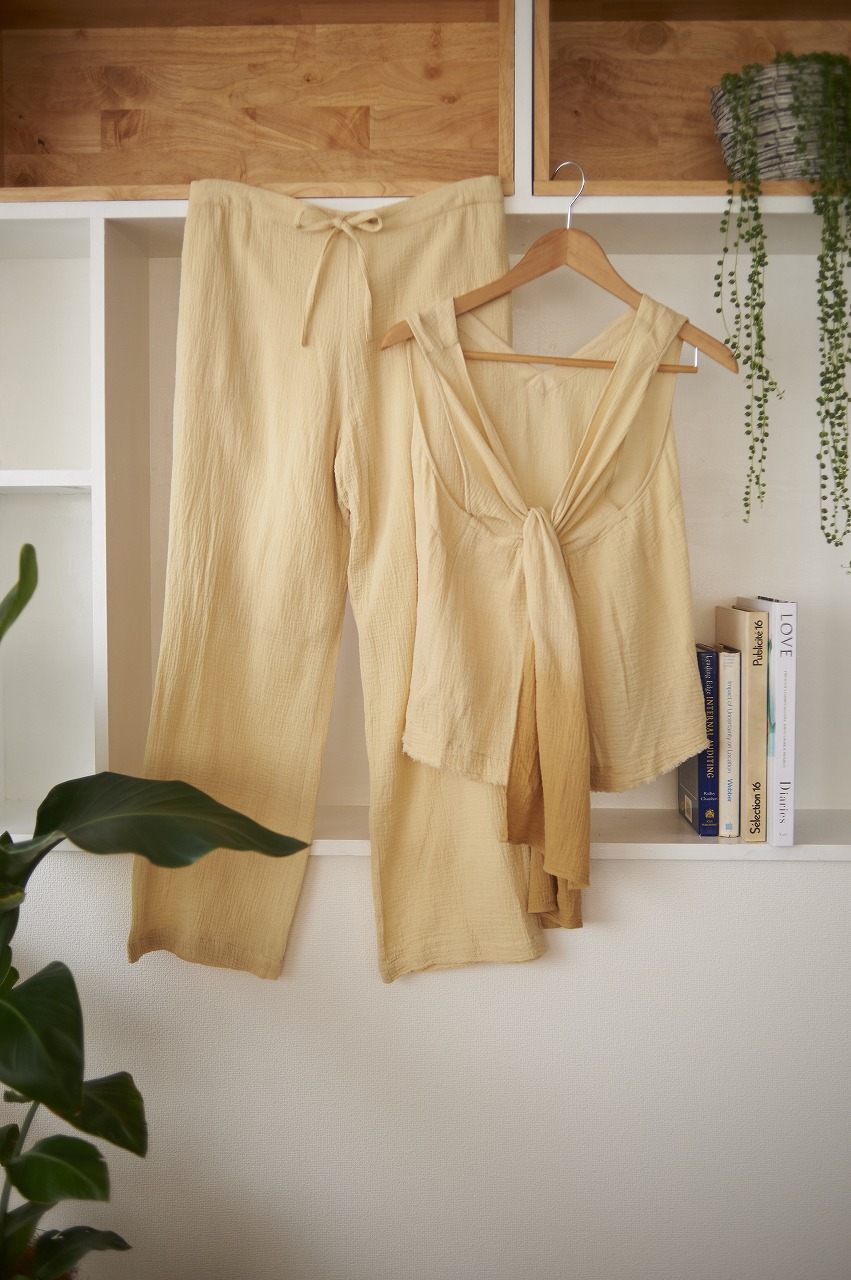 夏場に嬉しい、ソフトな風合いのコットンセットアップ。イエローの染料は、なんとマンゴー。洗濯のたびに優しく変化していく様子も楽しめます。コットントップス¥23,100パンツ¥28,600(ワランス/ロンハーマン)
