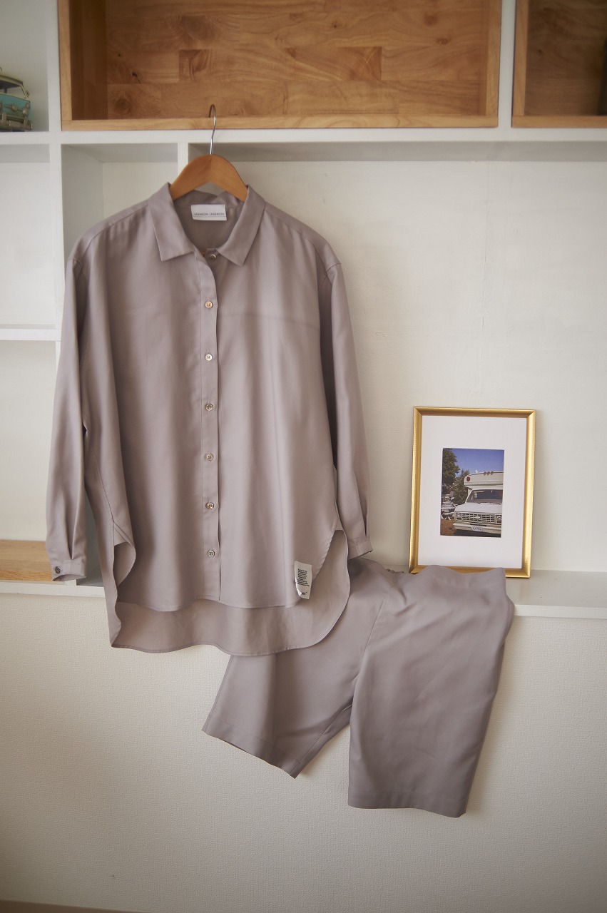 通気性に優れた、ジェンダーレスな雰囲気のパジャマセット。コーディネート次第で「ちょっとそこまで」も可能なスイリッシュさも魅力。ダブルクロスシャツ¥13,860ショートパンツ¥10,450(UNDERSON UNDERSON /UNDERSON UNDERSON ニュウマン新宿店)