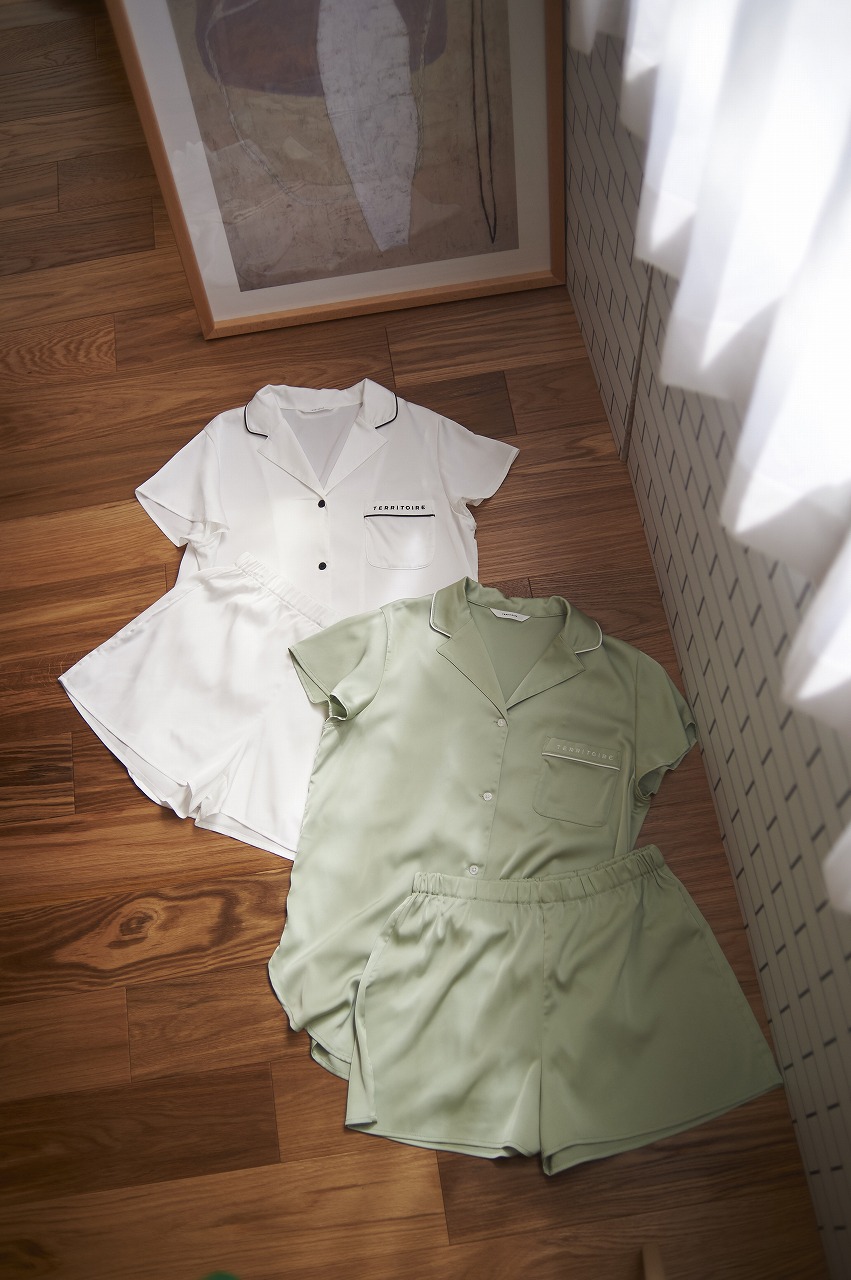 ストレッチ性のある半袖シャツ&ショーパンのパジャマには、リサイクルされた再生ポリエステル素材を使用。可愛いだけじゃない、地球にも自分にも嬉しいパジャマでいい夢を。パジャマ¥6,600(TERRITOIRE)
