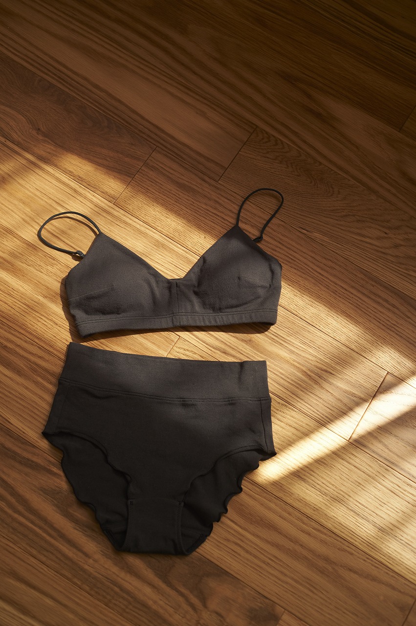 フォトグラファー花盛友里さんが立ち上げたアンダーウェアブランド「ストック」。ブラを三重層にすることでトップが透けず、締め付けないソフトな着心地を実現。ブラ¥6,930ショーツ¥4,950(ともにストック)