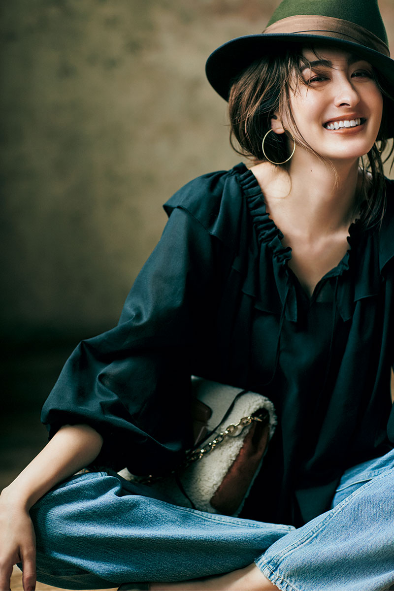 「黒の重たさを払拭したいから、胸元のリボンはあえて結ばずに。デコルテの肌見せで抜けを出したのがポイントです」と乾さん。ジェーン・バーキンを彷彿とさせる、力の抜けたデニムスタイルがセンスのよさを感じさせて。ブラウス¥17,600(スピック&スパン/スピック&スパン ルミネ有楽町店)デニムパンツ¥36,300(RHヴィンテージ/ロンハーマン)ハット¥23,400(CA4LA/CA4LAプレスルーム)ピアス¥58,300(ウノアエレ/ウノアエレ ジャパン)バッグ¥221,100(JIMMY CHOO)