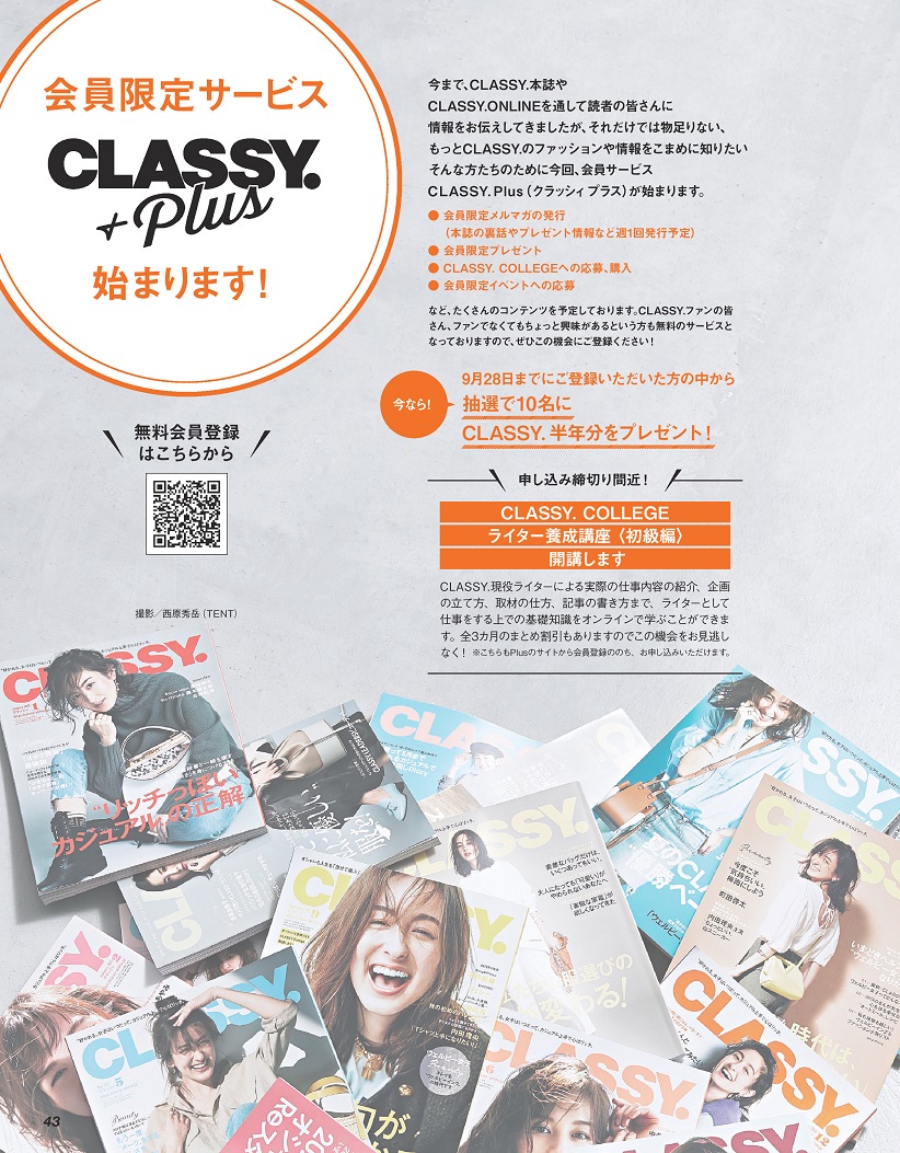 今月号の大ニュースのひとつがこちら。CLASSY.の会員限定サービス、その名もCLASSY.Plusが始まります。登録していただいた方にはプレゼントに応募できたり、会員限定のメルマガが読めたり…。CLASSY.の講座「CLASSY.COLLEGE」の申し込みもこちらからできます。こちらのオンラインからも申し込みページに飛べるのでお見逃しなく。
