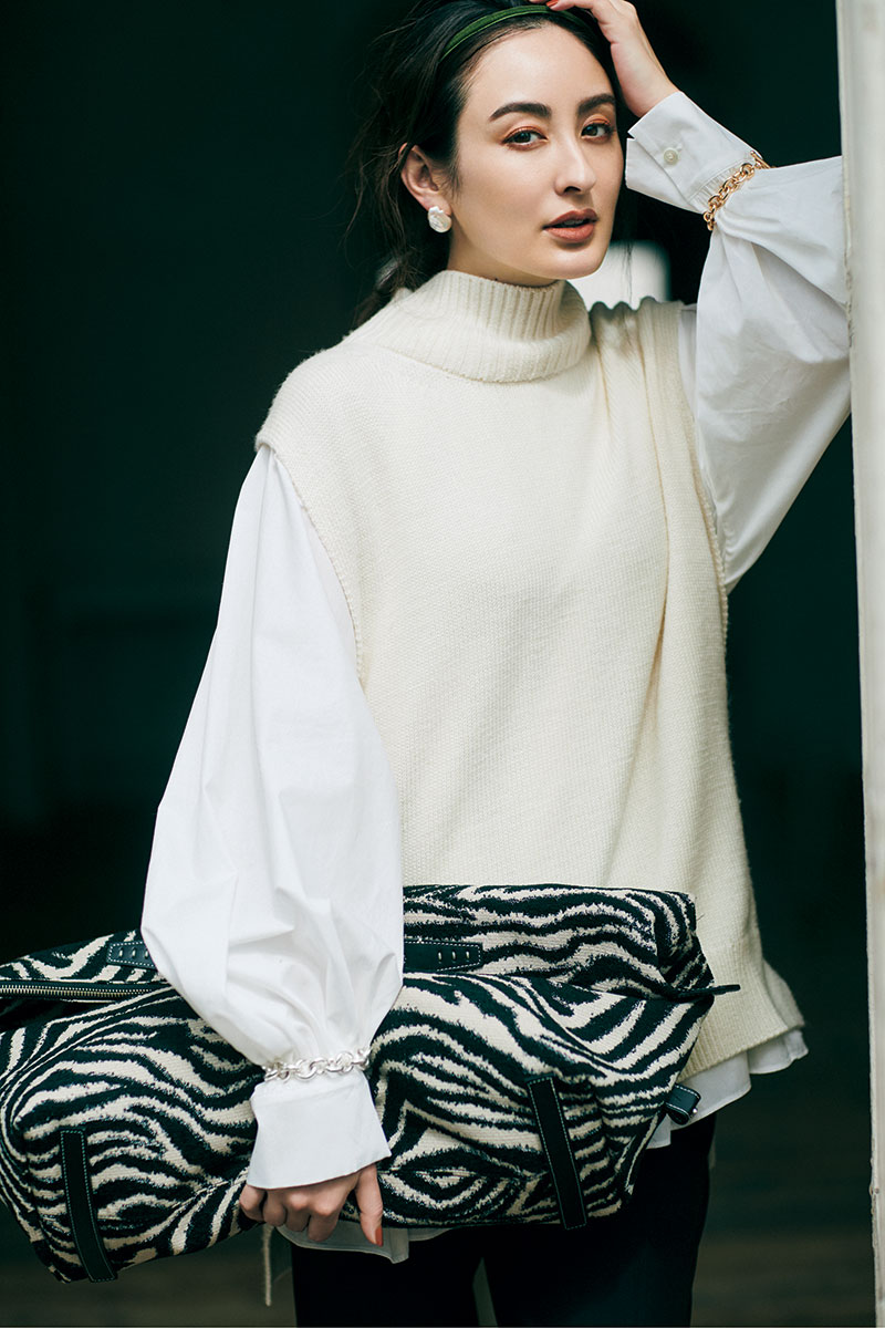 ブラウスとパンツのワンツーコーデにベストを重ねて、気の利いた印象に。「上半身を同色でまとめるのが大人っぽく見せるコツです」。ベスト¥26,400(アダワス/ショールーム セッション)シャツ¥13,000(ノーク)パンツ¥18,700(カデュネ/カデュネ プレスルーム)カチューシャ¥3,850〈ジェニファー オーレット〉バッグ¥59,400〈ア バケーション〉(ともにロンハーマン)ピアス¥24,200〈インツーデザイン〉ブレスレット右¥36,960〈パズコレクティブ〉(ともにZUTTO HOLIC)同左¥6,600(エイチアッシュ/フォーティーン ショールーム)