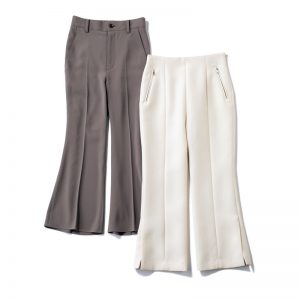 右/OLの定番白パンツは、今買い足すならほんのりモードな1本を。サイドスリット入り。パンツ¥26,400(エストネーション)左/通年活躍するニュアンスブラウン。サラリとしたはき心地も嬉しい。パンツ¥11,000(ハッシュニュアンス)