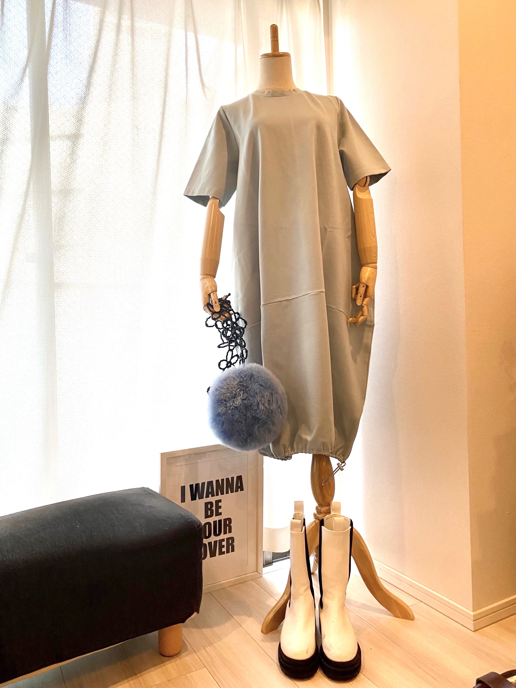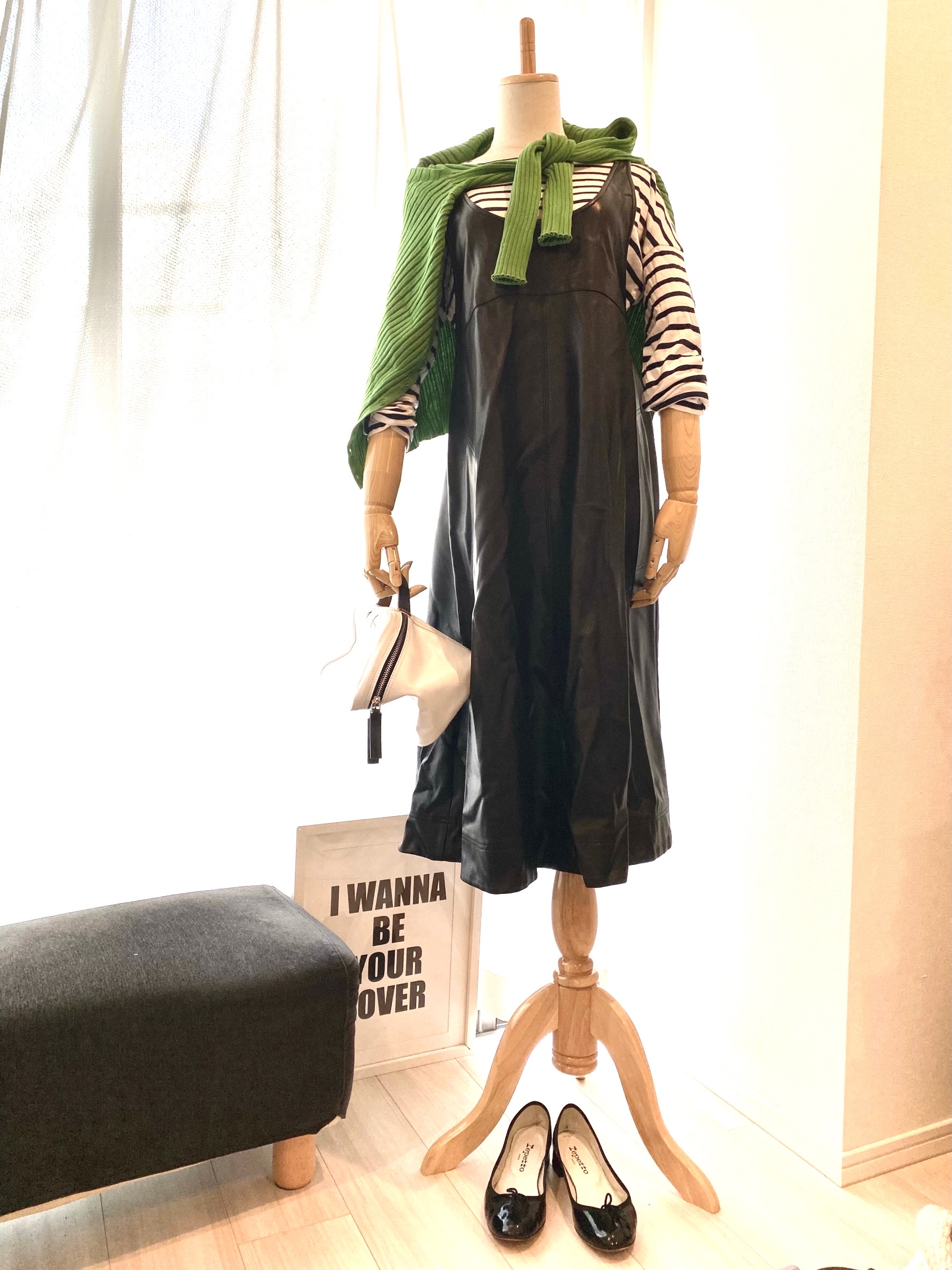 ウェーブタイプによく似合う、Aラインのワンピースは、フェイクレザーでデザインされた一枚で少し辛口に仕上げて。秋口は薄いカットソーを、真冬はニットを、夏はTシャツなどインナー次第で1年中使える優秀さ。