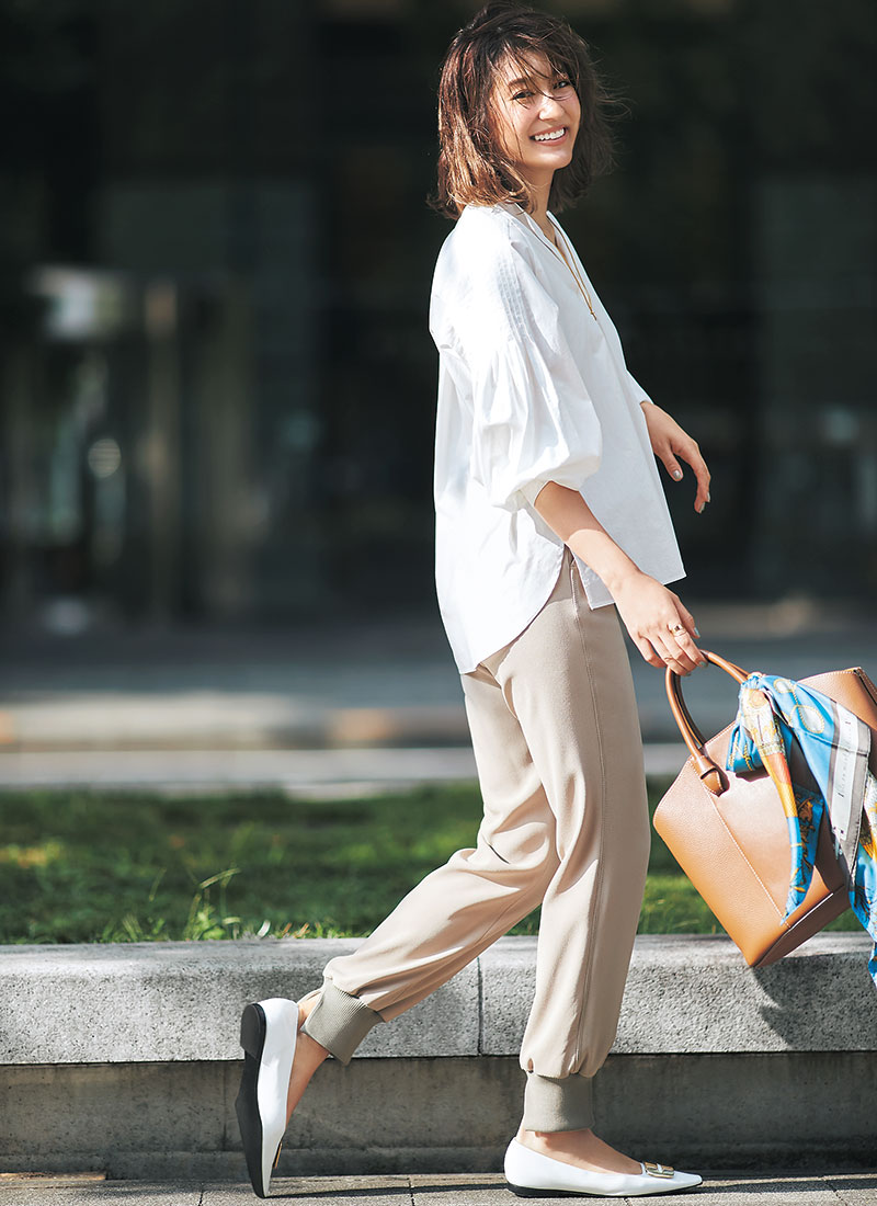 盛り袖ブラウスに淡色ジョグパンを合わせてエレガントに