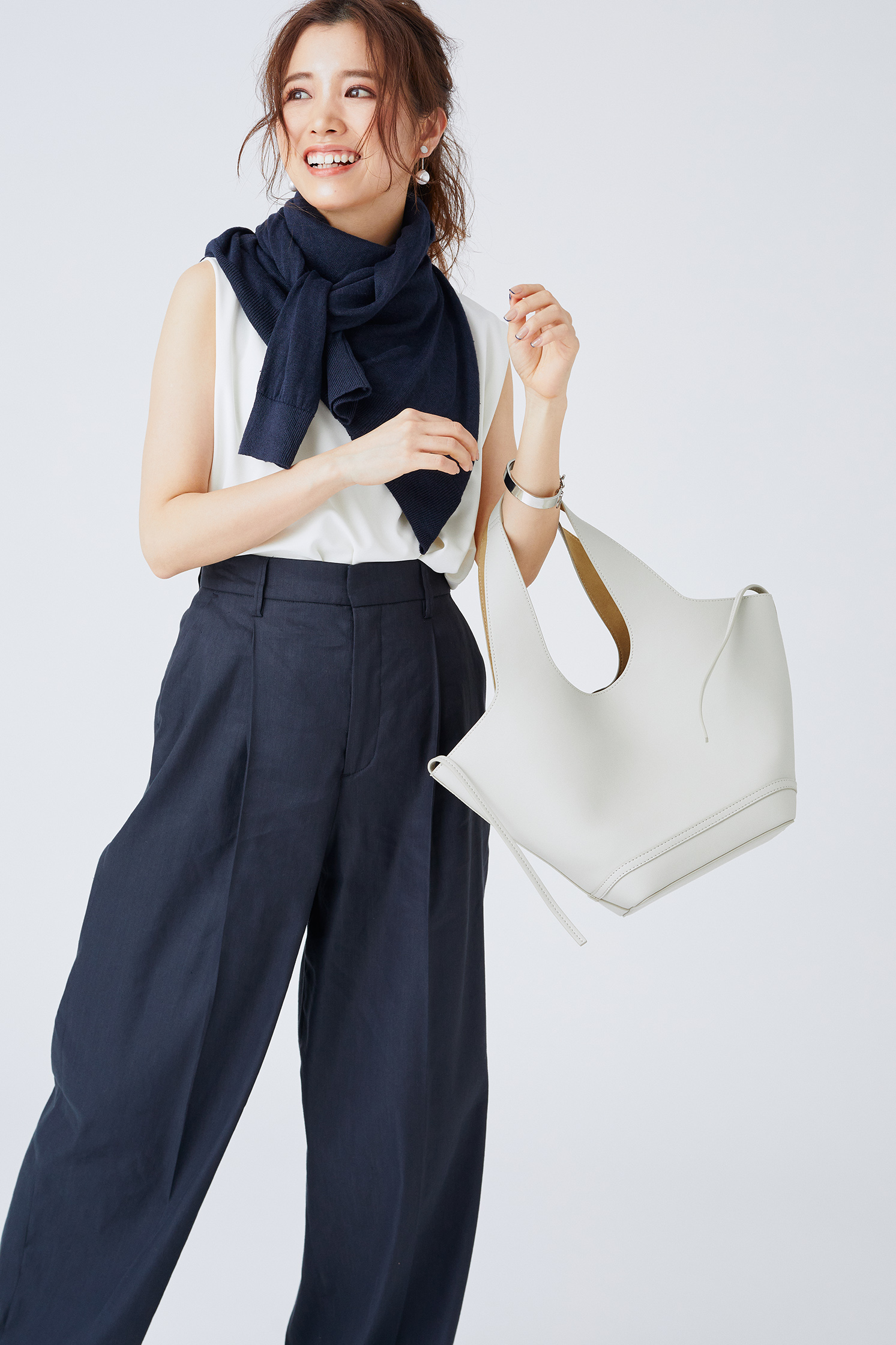 カーディガン¥3,990(無印良品/無印良品 銀座)ブラウス¥1,500(UNIQLO)パンツ¥26,400(ヤヌーク/カイタックインターナショナル)バッグ¥44,000(ヴァジック/ヴァジックジャパン)パンプス¥14,850(ダイアナ ウェルフィット/ダイアナ 銀座本店)ピアス¥5,940バングル¥8,640(ともにアビステ)