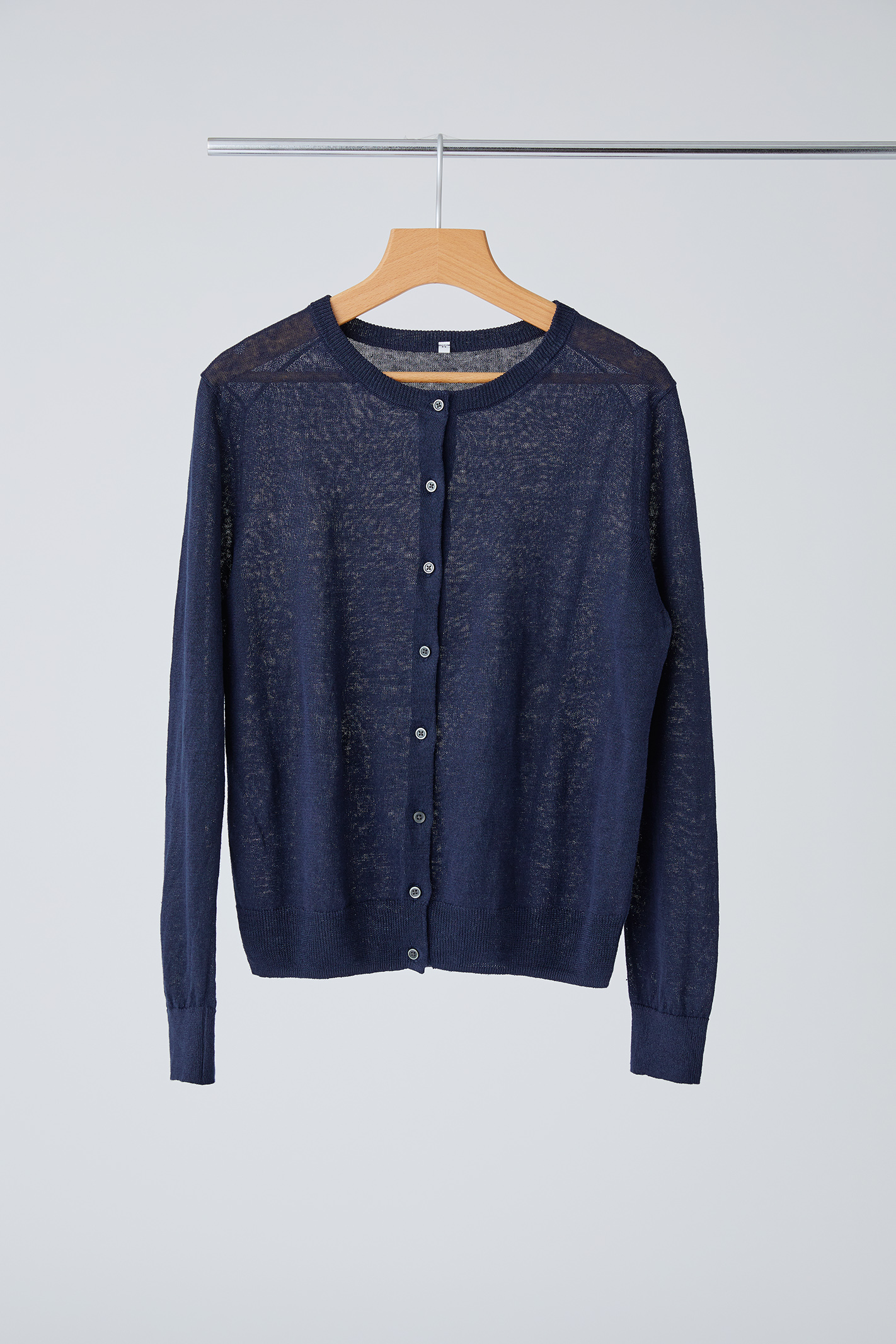 定番クルーネックは、フレンチリネン素材で涼しく、UVカット機能つき。カーディガン¥3,990(無印良品/無印良品 銀座)