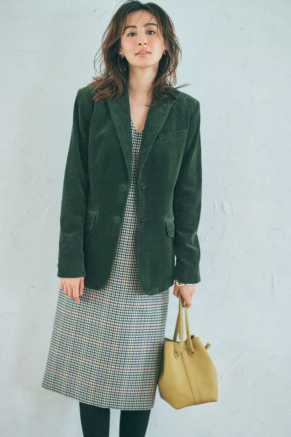 グッドガールな印象のワンピスタイルにはコーデュロイのジャケットで変化を