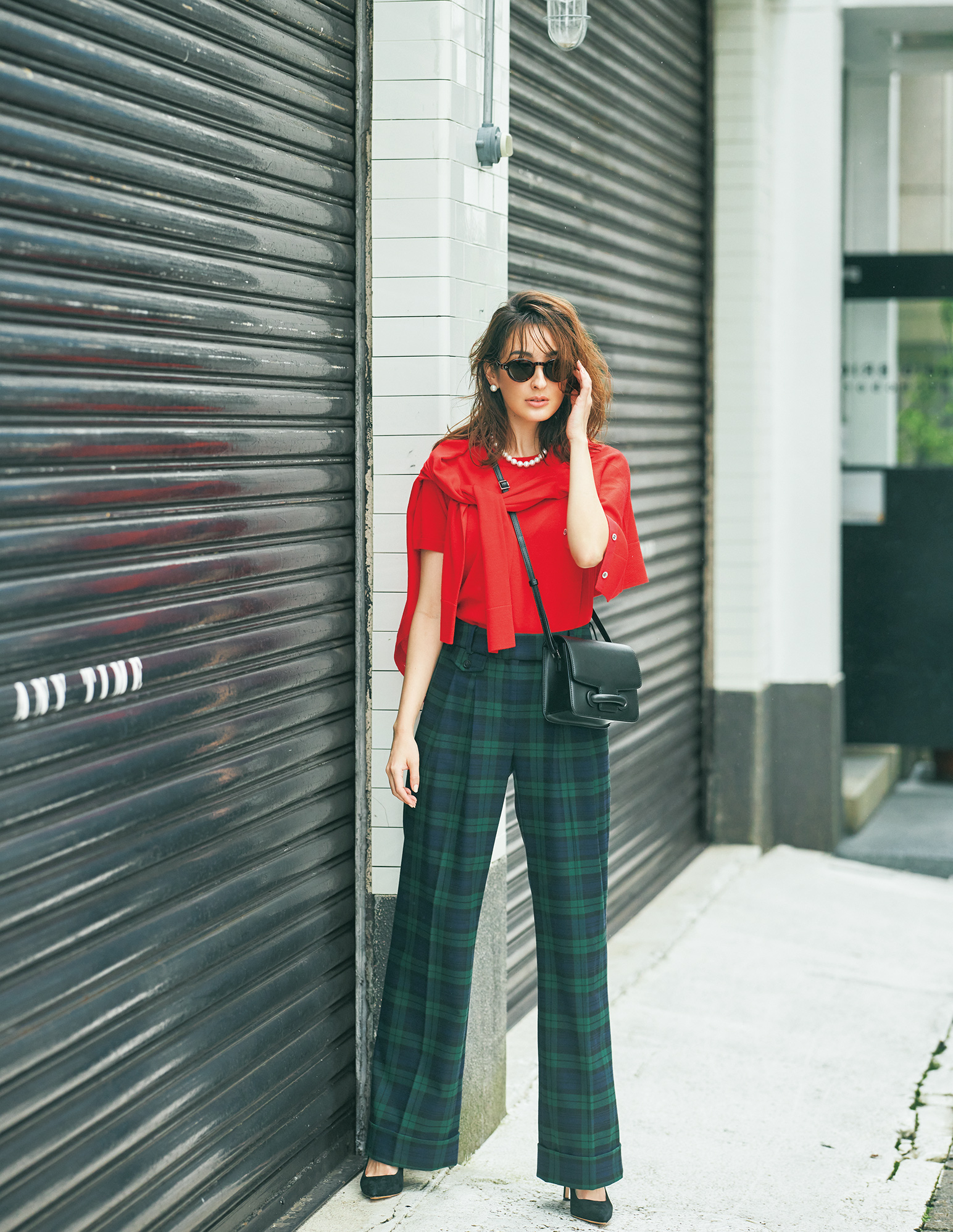 シックなチェックのワイドパンツは赤のニットで華やかに