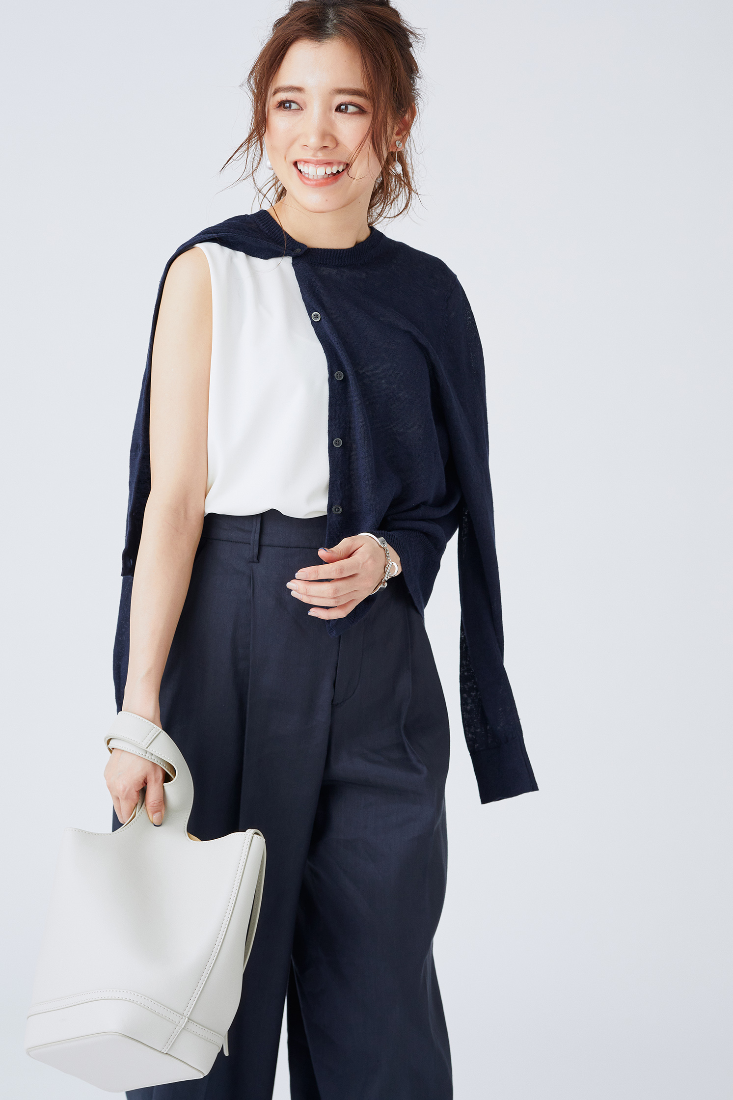 腕を通さない&身頃をななめにするだけでいつもより洗練度がアップ。カーディガン¥3,990(無印良品/無印良品 銀座)ブラウス¥1,500(UNIQLO)パンツ¥26,400(ヤヌーク/カイタックインターナショナル)バッグ¥44,000(ヴァジック/ヴァジックジャパン)パンプス¥14,850(ダイアナ ウェルフィット/ダイアナ 銀座本店)ピアス¥5,940バングル¥8,640(ともにアビステ)