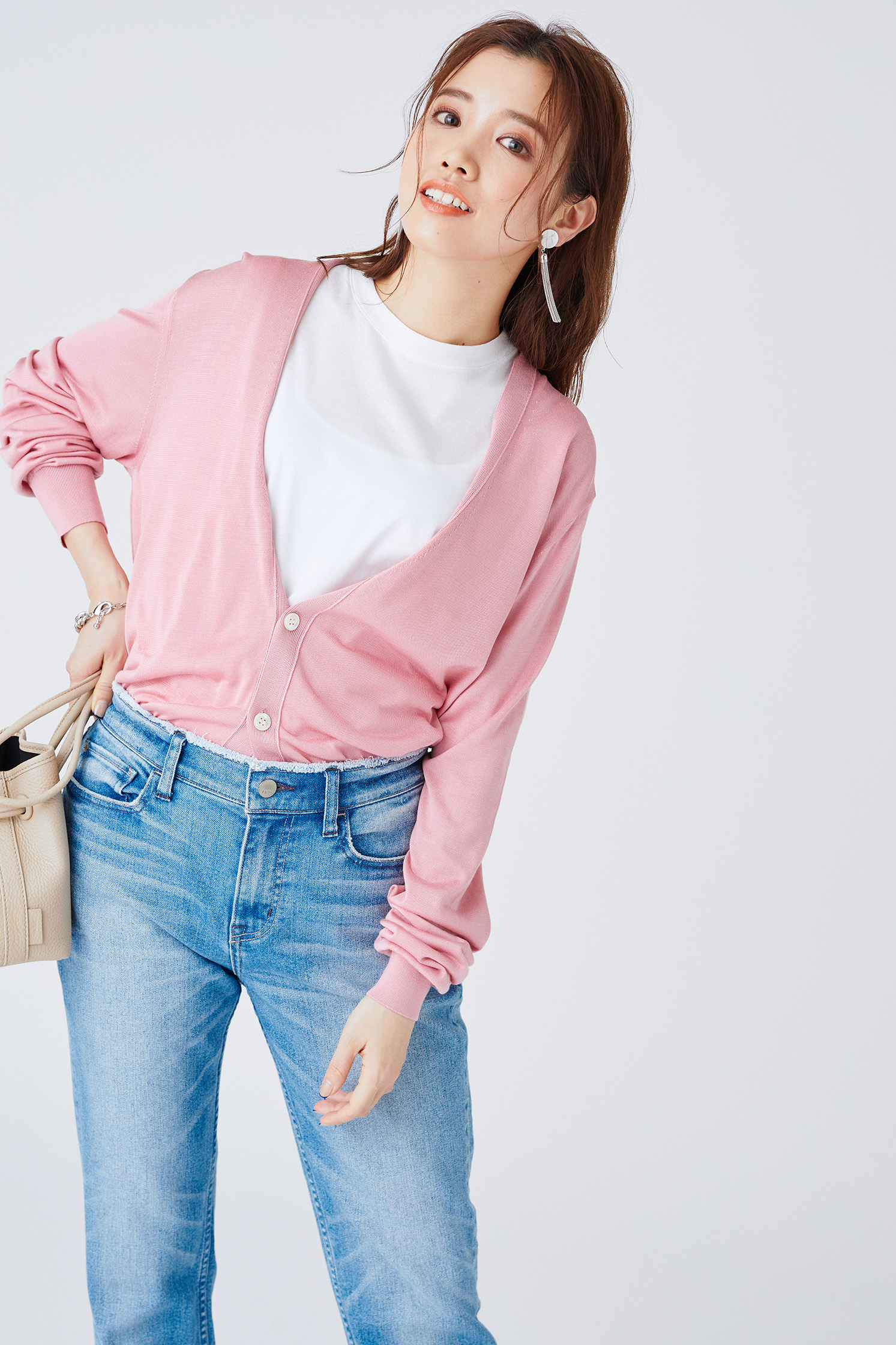 カーデ1枚で、トップス風の着こなしに!マンネリがちなこの時期に試したい新鮮アレンジです。シルク100%のスムースな手触りも魅力。カーディガン¥34,100カットソー¥8,580(ともにスローン)デニムパンツ¥15,400(ヘルシーデニム/ゲストリスト)バッグ¥36,300(ヴァジック/ヴァジックジャパン)