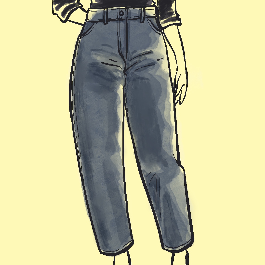 腿のあたりがふんわり膨らんで、裾にかけて緩やかに絞られ、バナナのようなカーブがついているシルエットのデニム。腿やふくらはぎなど気になる部分をカバーしつつ、リラックスした今っぽい雰囲気を叶えてくれます。