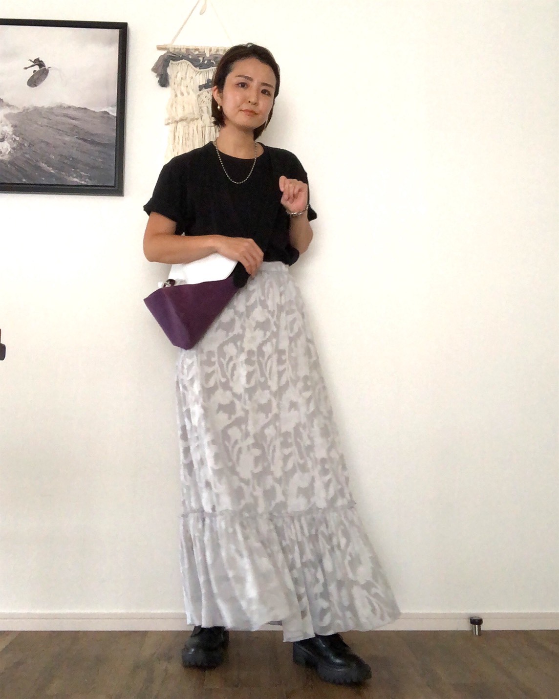 「甘めのスカートを辛口に仕上げたいときに、ユニクロのメンズTが重宝します。編み上げブーツ、スエードバッグをプラスして、小物から秋を取り入れました」