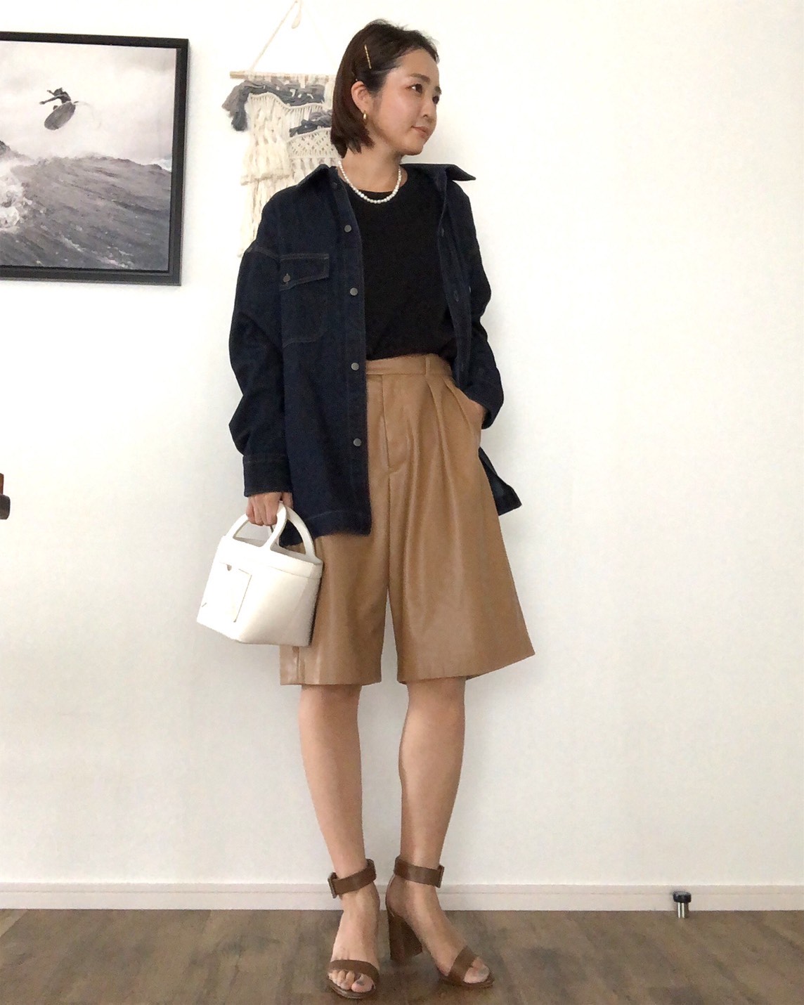 「Uniqlo Uのメンズデニムシャツを重ねてボーイッシュに。上半身が重いので、ハーフパンツと女っぽいサンダルを合わせてバランスを取りました」