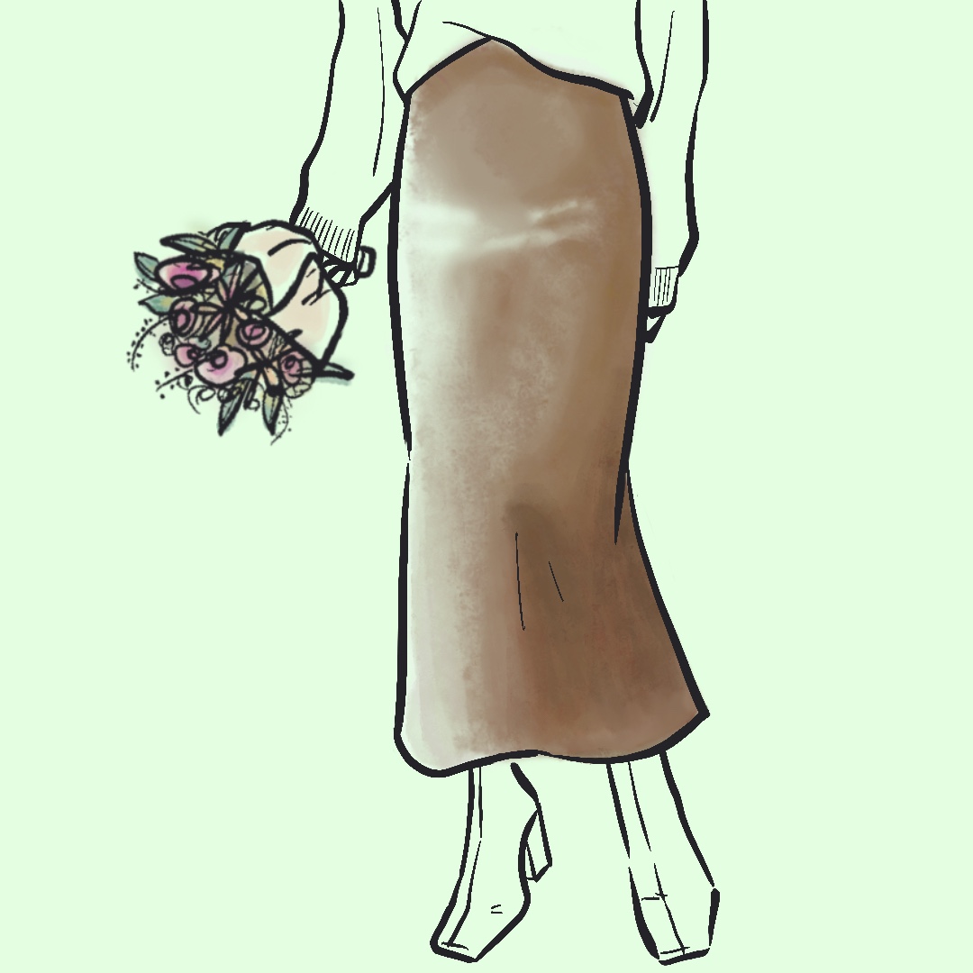 英語で「狭い、細い」の意味のナロー(narrow)の言葉のとおり、ナロースカートとは体のラインに沿った細身シルエットのスカートのことをいいます。タイトスカートと同類ではありますが、タイトスカートは膝丈なのに対して、今流行しているナロースカートは膝下~足首くらいまでの長め丈のスカートのことを指します。光沢素材のナロースカートが流行しているせいで、光沢素材のスカート=ナロースカートと勘違いしている人も多いよう。