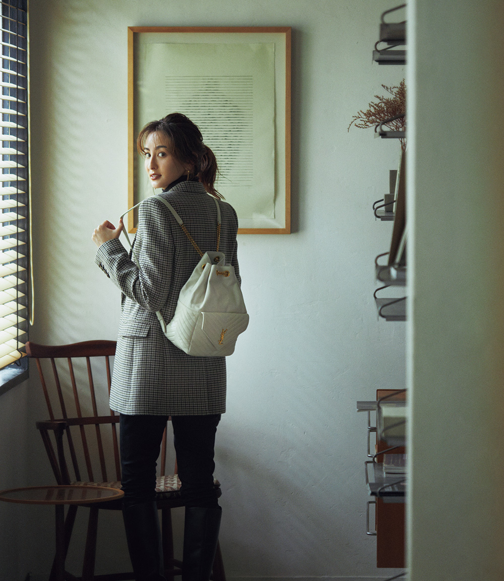 こっくりとした秋色のツイードジャケットに白のレザーバックパックを合わせてカジュアルミックスするのが新鮮。キルティングレザーの柔らかさがメンズライクなスタイルを上品に仕上げます。バッグパック「JOE」〈H29×W22×D15㎝〉¥287,100ジャケット¥363,000ニット¥126,500デニムパンツ¥82,500ロングブーツ¥269,500ピアス¥82,500(すべてサンローラン バイ アンソニー・ヴァカレロ/サンローラン クライアントサービス)