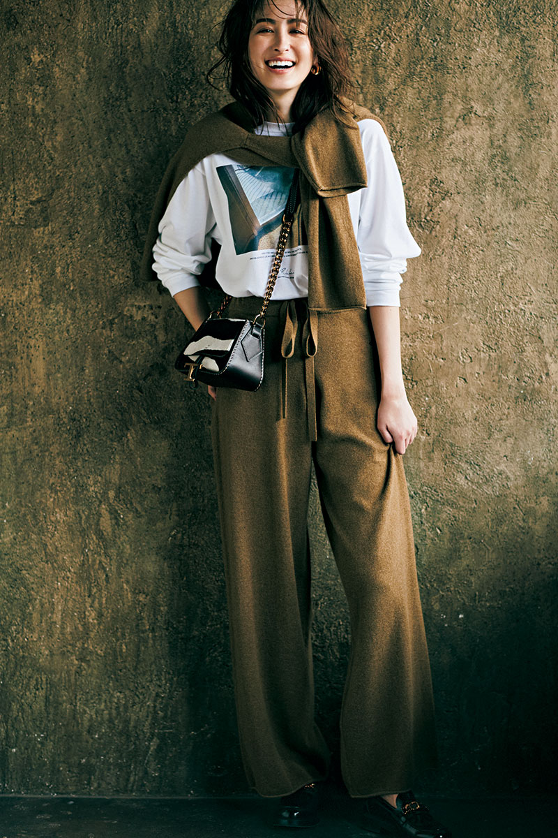 「カラーのフォトTは、中の色を1色拾ってスタイリングにリフレインさせるとバランスよくまとまります」。楽ちんムードなニット合わせなら、アクセサリーや存在感のあるバッグでインパクトを出すのが、スタイリッシュな着こなしに導くコツ。Tシャツ¥9,350(+81 BRANCA/UTS PR)パンツ¥53,900肩にかけたニット¥47,300(ともにAMAN ONLINE STORE限定・アンスクリア/アマン)バッグ¥237,600ローファー¥94,600(ともにトッズ/トッズ・ジャパン)ピアス¥29,700(シンパシーオブ ソウル スタイル/フラッパーズ)
