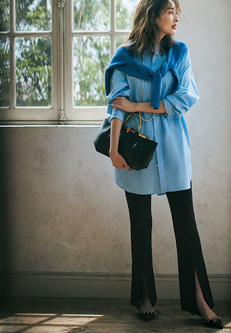 今までよく合わせがちだったレギンスや九分丈パンツと一線を画す、新しいバランスに注目。「足元が軽やかに仕上がるスリットパンツは、合わせる靴を選ばないのも優秀です」。パンツ¥22,000(LEPHIL/LEPHIL NEWoMan新宿店)シャツ¥28,600(トラディショナル ウェザーウェア/トラディショナル ウェザーウェア青山店)肩にかけたニット※10月上旬発売予定¥8,910(グリーンレーベル リラクシング/ユナイテッドアローズ グリーンレーベル リラクシング自由が丘店)バッグ¥179,300(ザンケッティ/八木通商)パンプス¥31,900(ツル バイ マリコ オイカワ)ネックレス¥46,200(インディアンジュエリー/ロンハーマン)リング¥25,300(e.m./e.m.表参道店)