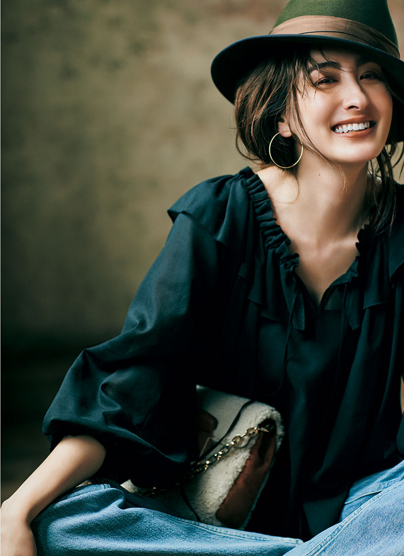 「黒の重たさを払拭したいから、胸元のリボンはあえて結ばずに。デコルテの肌見せで抜けを出したのがポイントです」と乾さん。ジェーン・バーキンを彷彿とさせる、力の抜けたデニムスタイルがセンスのよさを感じさせて。ブラウス¥17,600(スピック&スパン/スピック&スパン ルミネ有楽町店)デニムパンツ¥36,300(RHヴィンテージ/ロンハーマン)ハット¥23,400(CA4LA/CA4LAプレスルーム)ピアス¥58,300(ウノアエレ/ウノアエレ ジャパン)バッグ¥221,100(JIMMY CHOO)