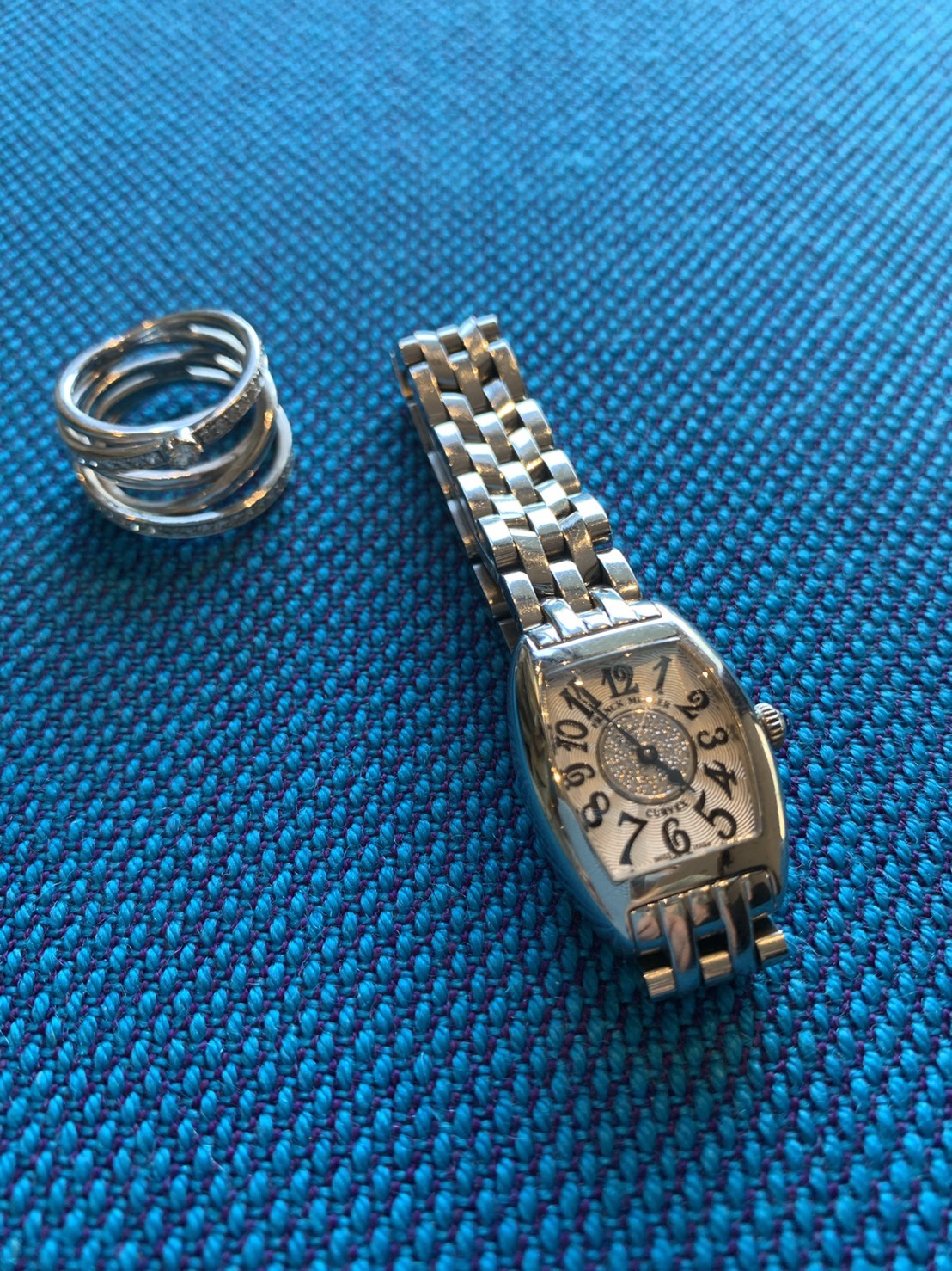 「アラサー時代にダイヤモンドの時計が欲しくて選んだトノータイプ。華奢な27mmサイズはジュエリー感覚で使えて、ギラギラしていない文字盤のダイヤのデザインに惚れました。『どこの?』とよく聞かれるので、一見ブランドがわからないところもお気に入り。購入当時はクロコのレザーベルトで、ネイビー、ホワイトと季節ごとにチェンジしてクラシカルな雰囲気を楽しんでいましたが、ちょっと大人になった今は気分や似合うものが変わったので、ブティックに持ち込んでステンレススティールのベルトにお着替え。ベルトだけでも値が張りましたが(笑)、思い切ってチェンジしてよかった!ゴールドのジュエリーとミックスして、今っぽい手元を楽しんでいます」