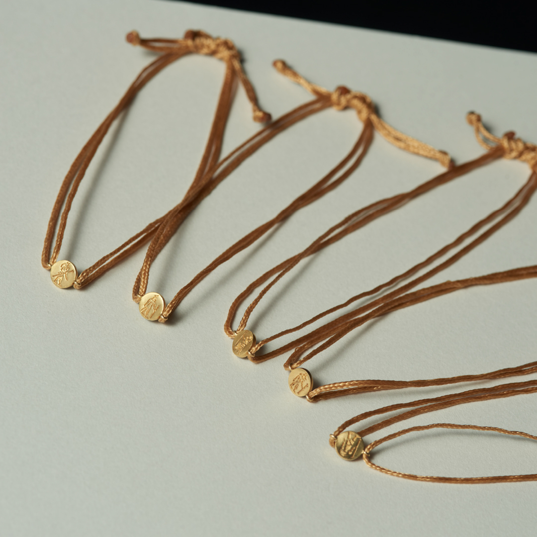 インドの女性を支援するNGOにて制作しているコードブレスレットの新作。最古の星座と言われる神秘的な古代エジプト星座を彫り込んだプチコインチャームがあしらわれ、シックな雰囲気。同じNGOの女性たちが手作りするミニポーチも付属します。