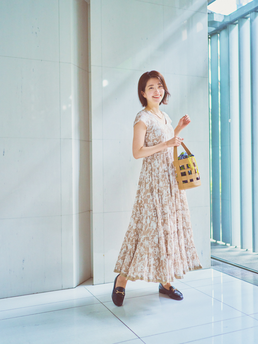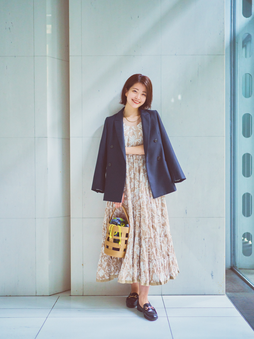 東さんがジャケットに合わせているのは、CLASSY.ClosetがMARIHAに別注カラーをオーダーしたワンピース。品のあるベージュが、大人の肌を美しく見せてくれるんです。トラッドなローファーとの合わせも素敵でした。