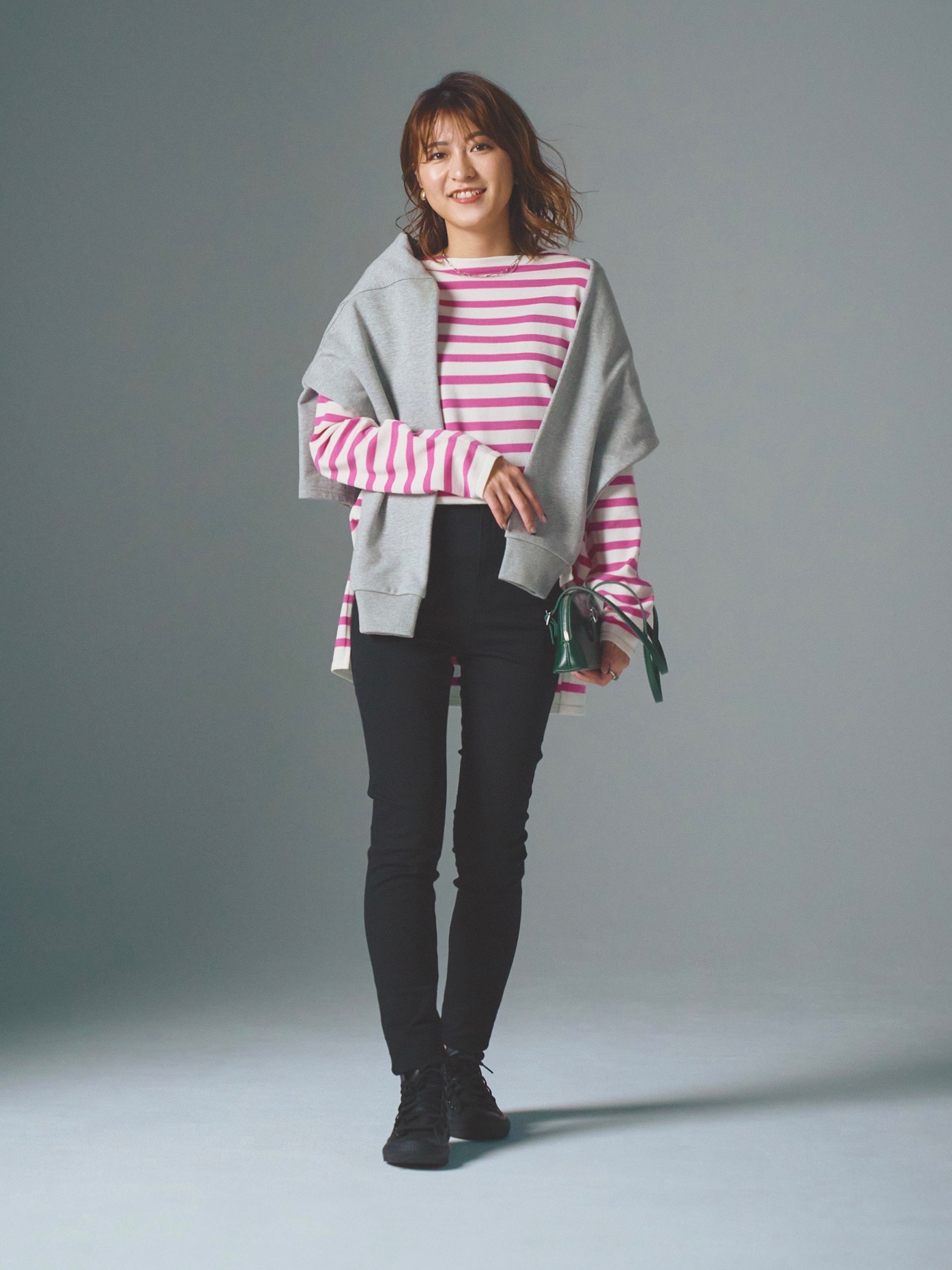 ハイウエストスキニーパンツ¥1,690(GU[ジーユー])ボーダーカットソー¥18,700(UNITED ARROWS/ユナイテッドアローズ 有楽町店)スウェット¥2,990(Gap/Gap新宿フラッグス店)ミニバッグ¥4,990(MANGO/ロコンド)ネックレス¥2,090 イヤリング¥2,310 リング¥1,980※2個セット価格(すべてGOLDY)スニーカー(スタイリスト私物)