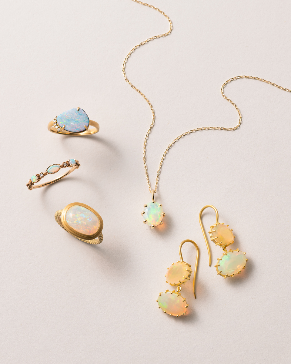 見る角度や光の入り方によって色合いを変化させる“遊色効果”が、オパールの特徴である虹色の輝きをつくりだす。
