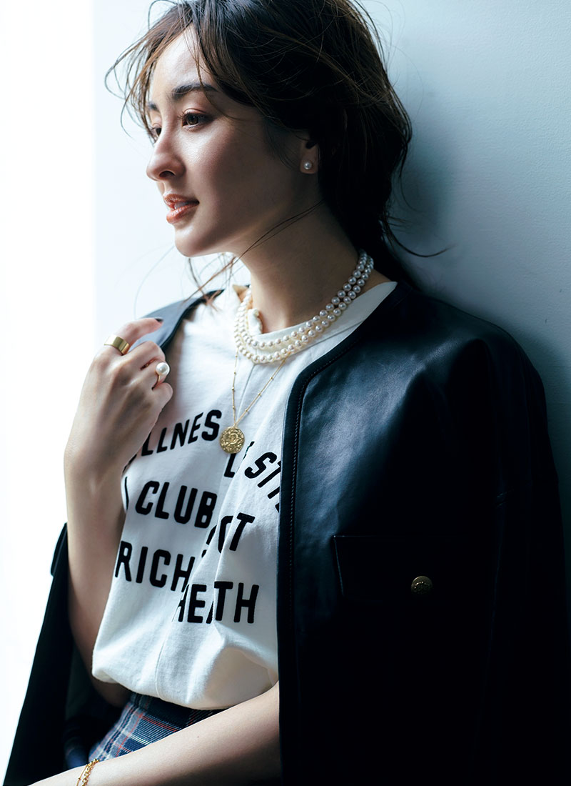 Tシャツをキャンバスに、レイヤードで楽しむパールとチェーン
