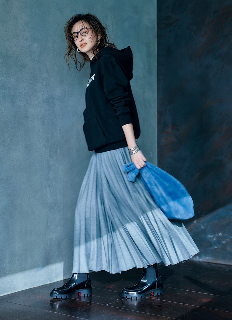 ロゴ入りビッグフーディにたっぷりとしたマキシスカートで甘さを添えたミックスコーデ。ラグブーツで足元に重みを出してプリーツのコンサバ感を払拭すれば、グッとこなれたムードに。フーディ¥22,000(スローン)スカート¥75,900(ebure/ebure GINZA SIX店)バッグ¥47,300(アニタ ビラルディ/エストネーション)ブーツ¥172,700(クリスチャン ルブタン/クリスチャン ルブタンジャパン)メガネ¥8,800(JINS/JINS カスタマーサポートセンター)ピアス¥14,300バングル¥11,000(ともにワンエーアールバイウノアエレ/ウノアエレ ジャパン)