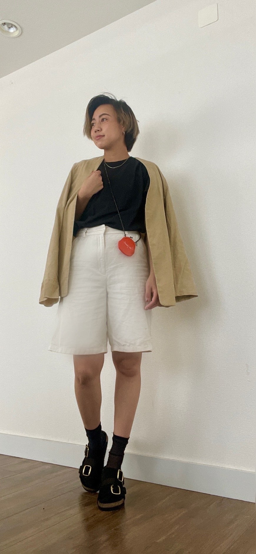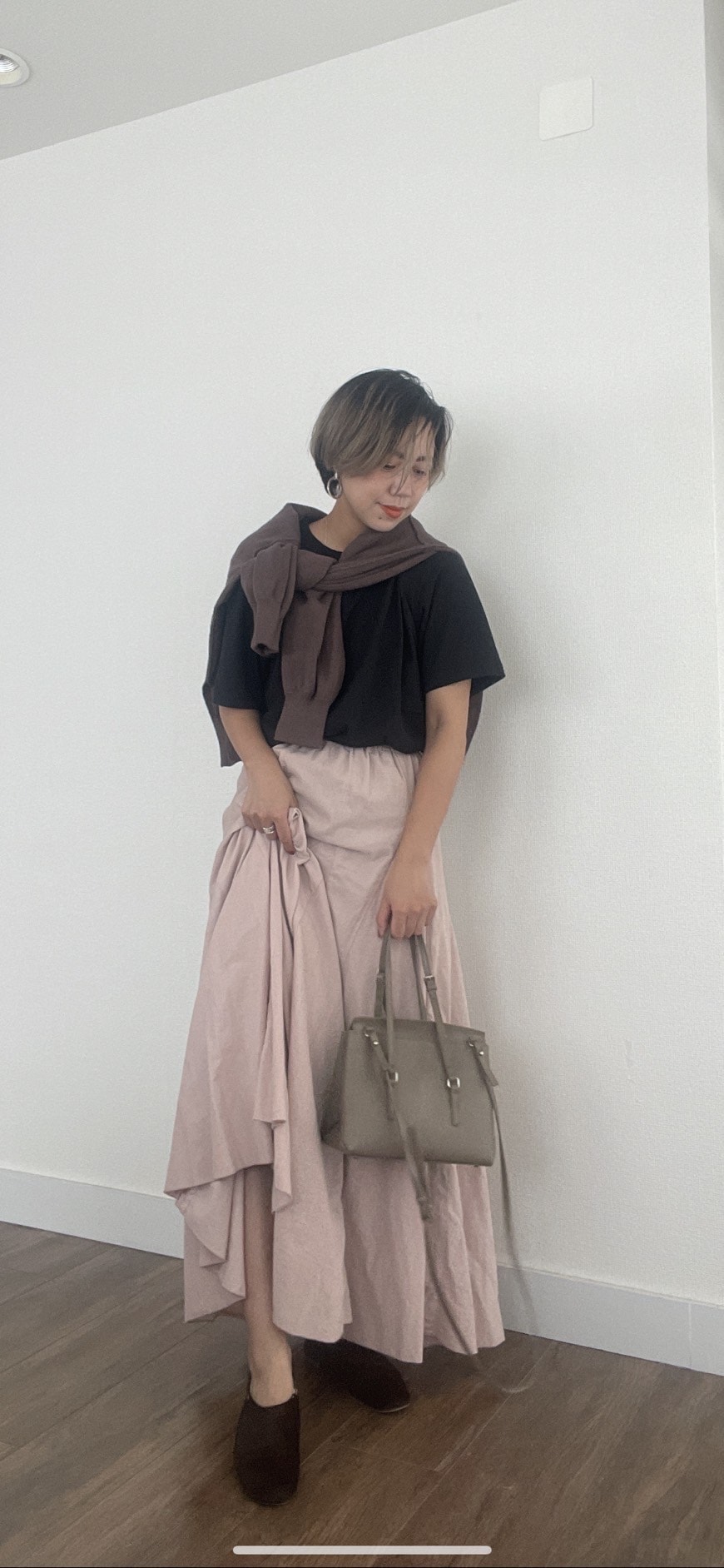 「トップスが黒のときは、羽織り、ボトムスともに明るめのベーシックカラーを合わせて、ワンポイントでカラーを入れるのが最近のお気に入りです」