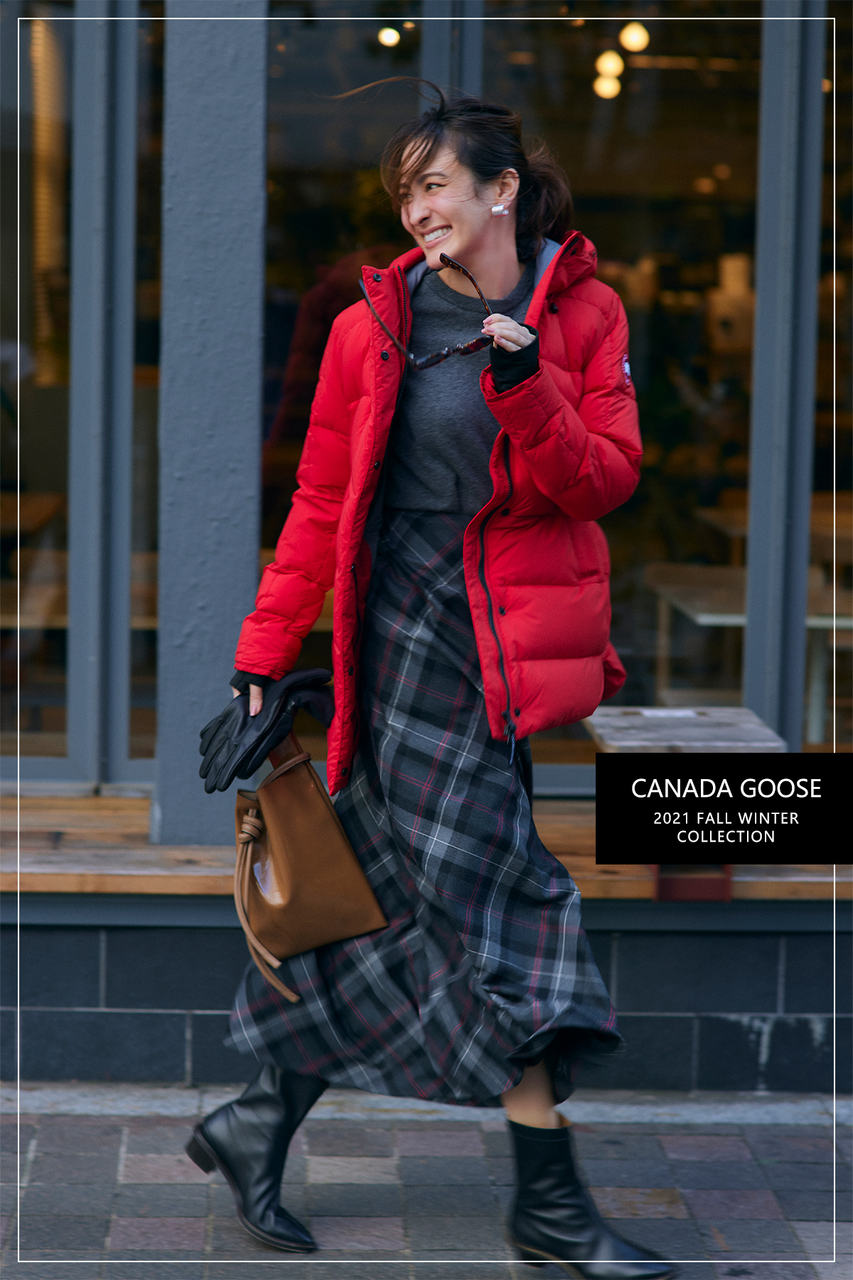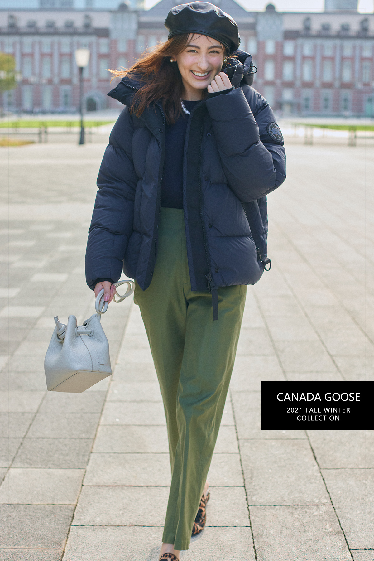ボリュームのあるショート丈のAラインシルエットで、どの角度から見てもカッコよくサマになる新作。ふんわりと軽くてあたたかく、ジップやポケットのDリングなど、細部のディテールもこなれています。 ダウンジャケット[フード取り外し可能]¥129,800 ニット¥46,200(ともにカナダグース)パンツ¥16,500(MACPHEE/TOMORROWLAND)バッグ¥36,300(ヴァジック/ヴァジックジャパン)シューズ¥26,400(ツル バイ マリコ オイカワ)ベレー帽¥17,930(CA4LA/CA4LA プレスルーム)イヤリング¥5,500ネックレス¥17,820(ともにアビステ)